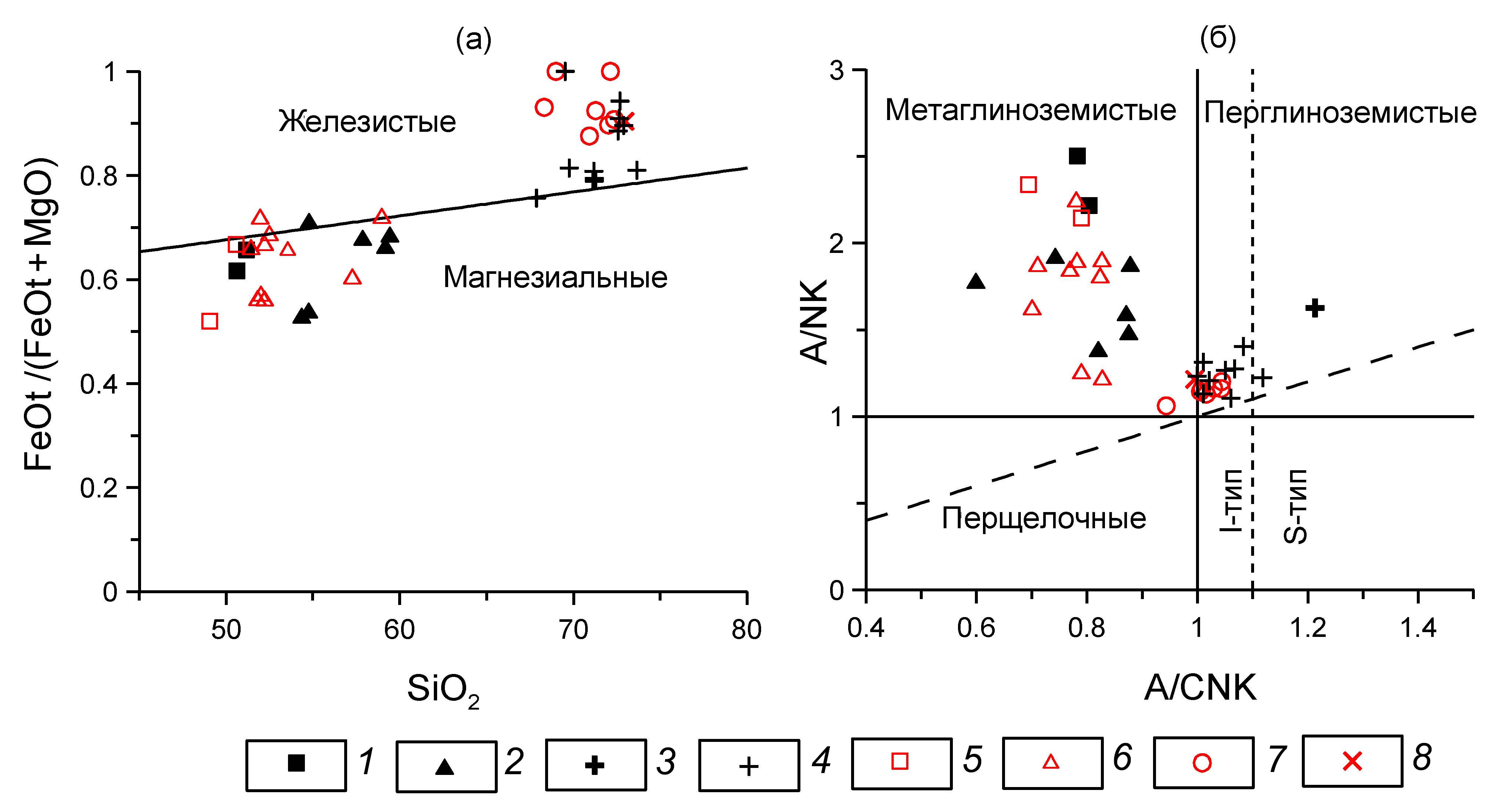 Фиг. 6. Диаграммы: а — SiO2 (мас. %) — FeOt/(FeOt+MgO), б — A/CNK — A/NK для магматических пород Сорского рудного узла.