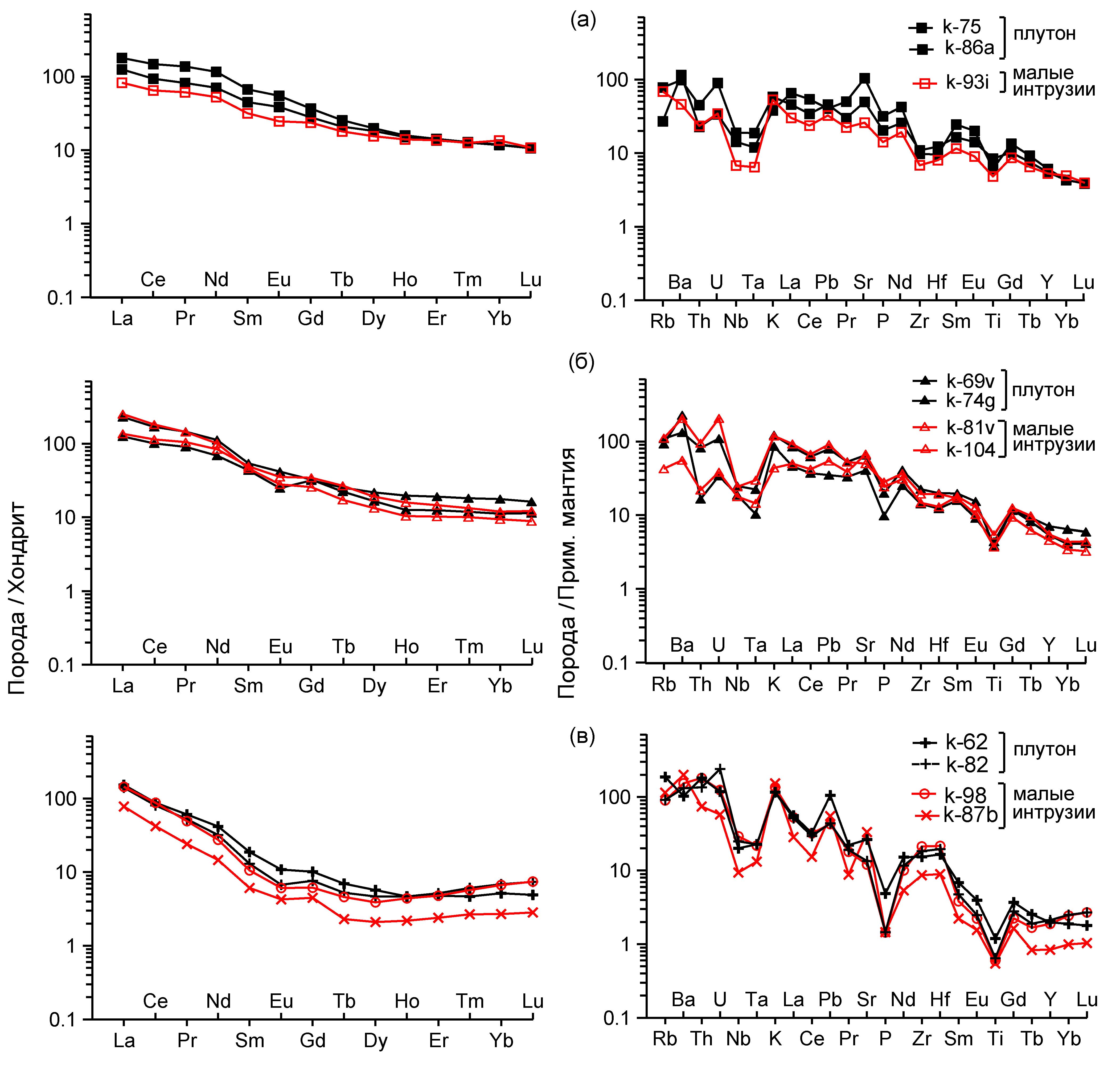 Мультиэлементные спектры габброидов плутона и малых интрузий (фиг. 7а) характеризуются низкими нормированными по примитивной мантии содержаниями высокозарядных и тяжелых редких земель относительно крупноионных (Rb, Ba, Sr) и легких редкоземельных элементов (La, Ce) и отрицательными аномалиями Nb, Ta, Zr, Hf и Ti. Им аналогичны спектры монцонитоидов (фиг. 7б). На спектрах гранитоидов отсутствуют аномалии Ba и Th, но хорошо выражены положительные аномалии Zr и Hf (фиг. 7в).