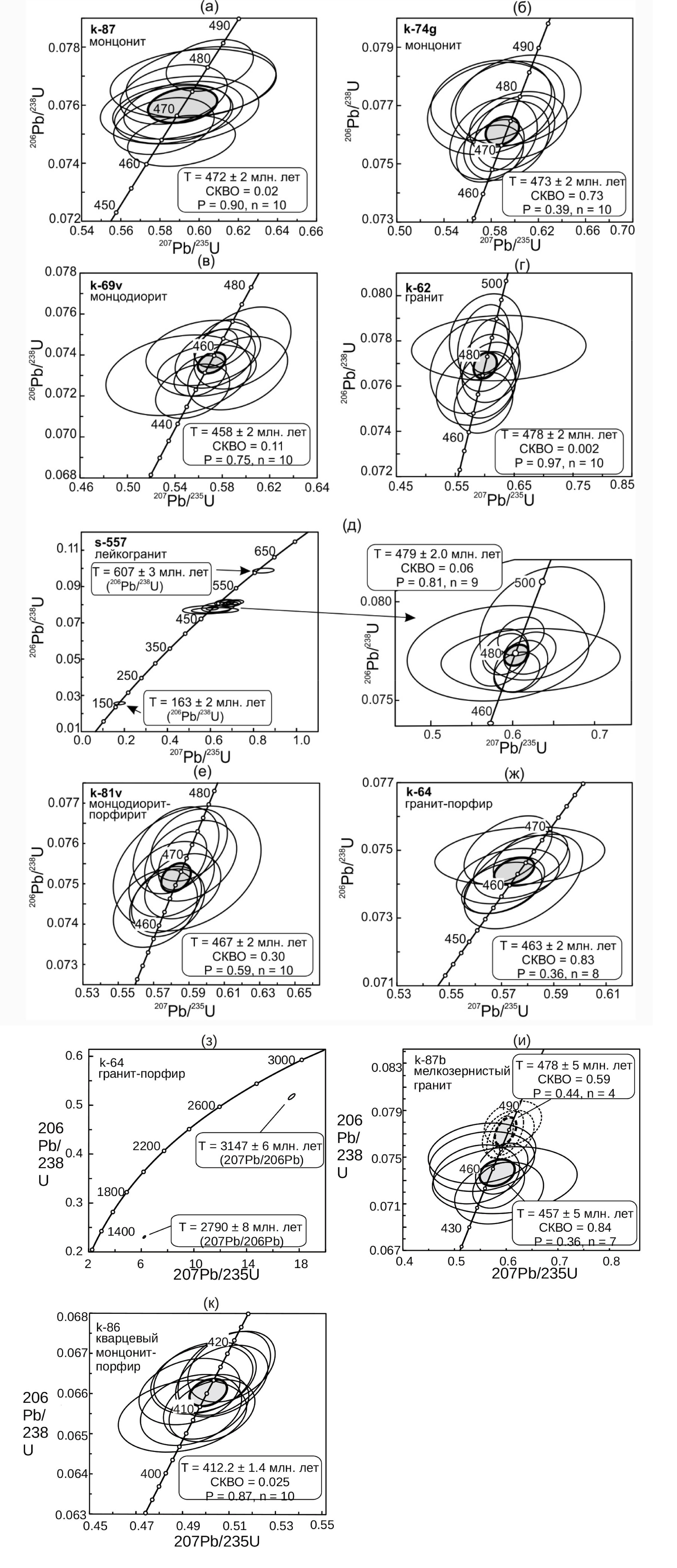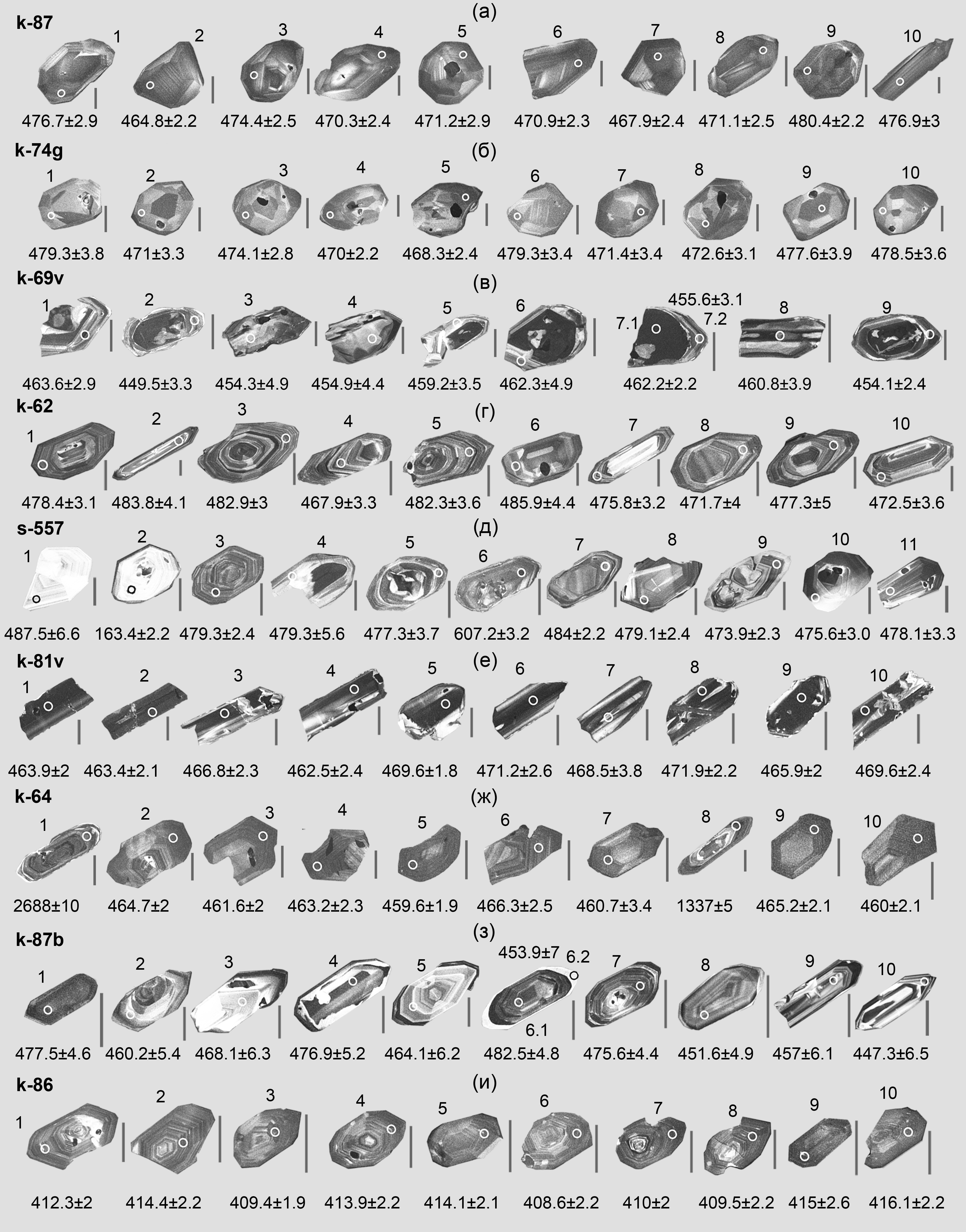 По ранее опубликованным результатам U-Pb геохронологических исследований пород Уйбатского плутона датировки (млн лет) составляют: габброиды и монцонитоиды когтахского комплекса — 470 ± 4, 483 ± 4, 489 ± 10 (Врублевский и др., 2018, Котельников и др., 2019), сиениты кашпарского комплекса — 483 ± 4, 480 ± 2 (Макаренко, Котельников, 2018), гранитоиды тигертышского комплекса — 495 ± 8, 493 ± 8 (Врублевский и др., 2016).