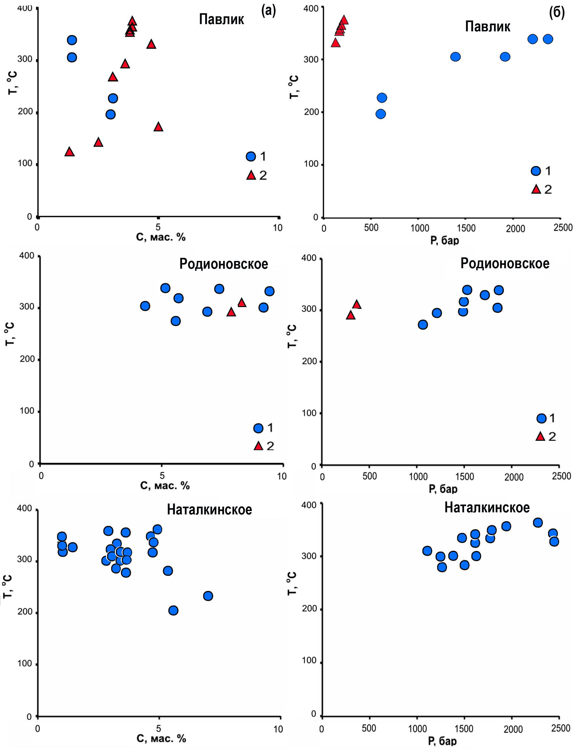 Рудообразующий флюид месторождения Павлик по составу, температурам и давлениям обнаруживает сходство с флюидами Наталкинского и Родионовского месторождений (фиг. 6) и обладает большим сходством с типичными флюидами орогенных жильных месторождений золота, для которых характерны низкие концентрации растворенных солей и высокие – углекислоты (Ridley, Diamond, 2000). Полученные результаты корреспондируют с метаморфогенно-магматогенной моделью формирования золотокварцевых месторождений Яно-Колымского пояса (Voroshin et al., 2014).