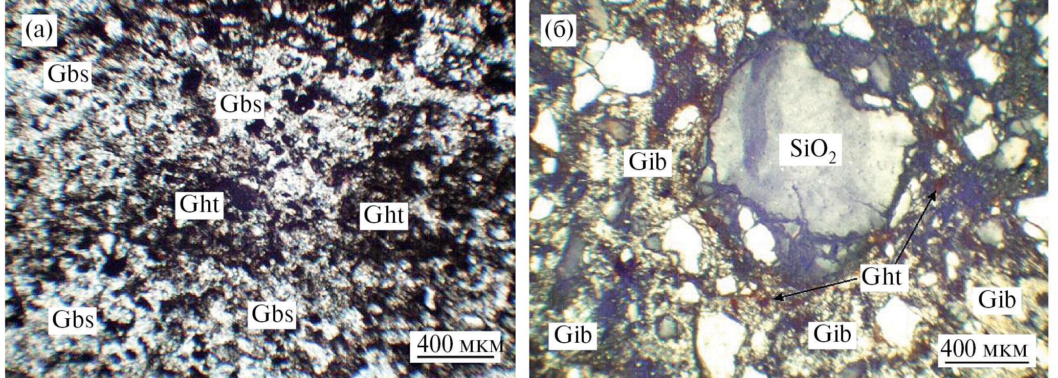 Фиг. 3. а – боксит, образованный по алевро-аргиллиту, б – боксит, образованный по кварцевым песчаникам. Прозрачный шлиф (ник. +). Gbs – гиббсит, Gth – гётит, SiO2 – кварц.