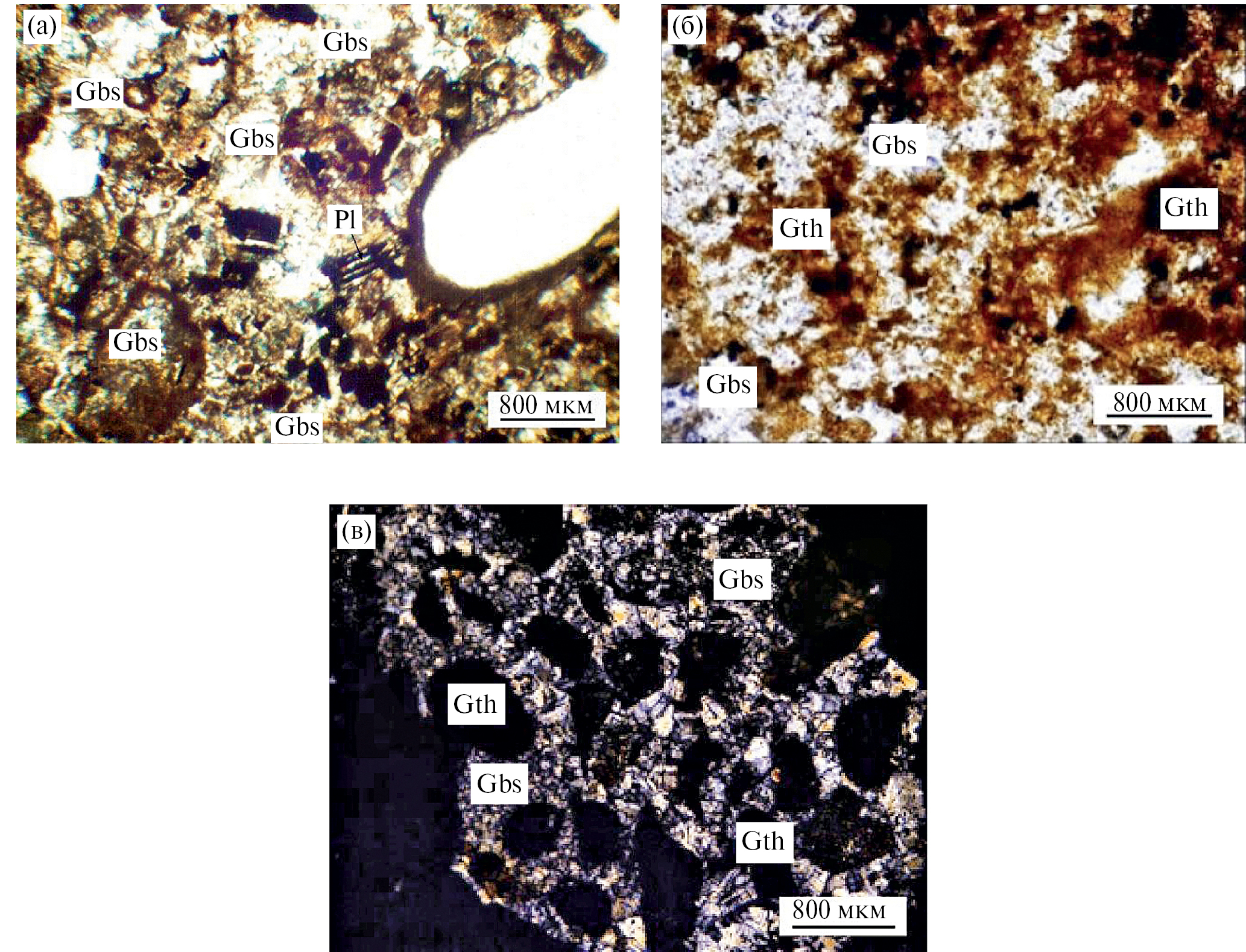 Фиг. 4. Боксит по долериту: а – брекчиевидный боксит, б – аподолеритовый боксит массивной текстуры, в – боксит массивной текстуры. Прозрачный шлиф(Ник. +, Pl – плагиоклаз, Gbs – гиббсит, Gth – гётит).