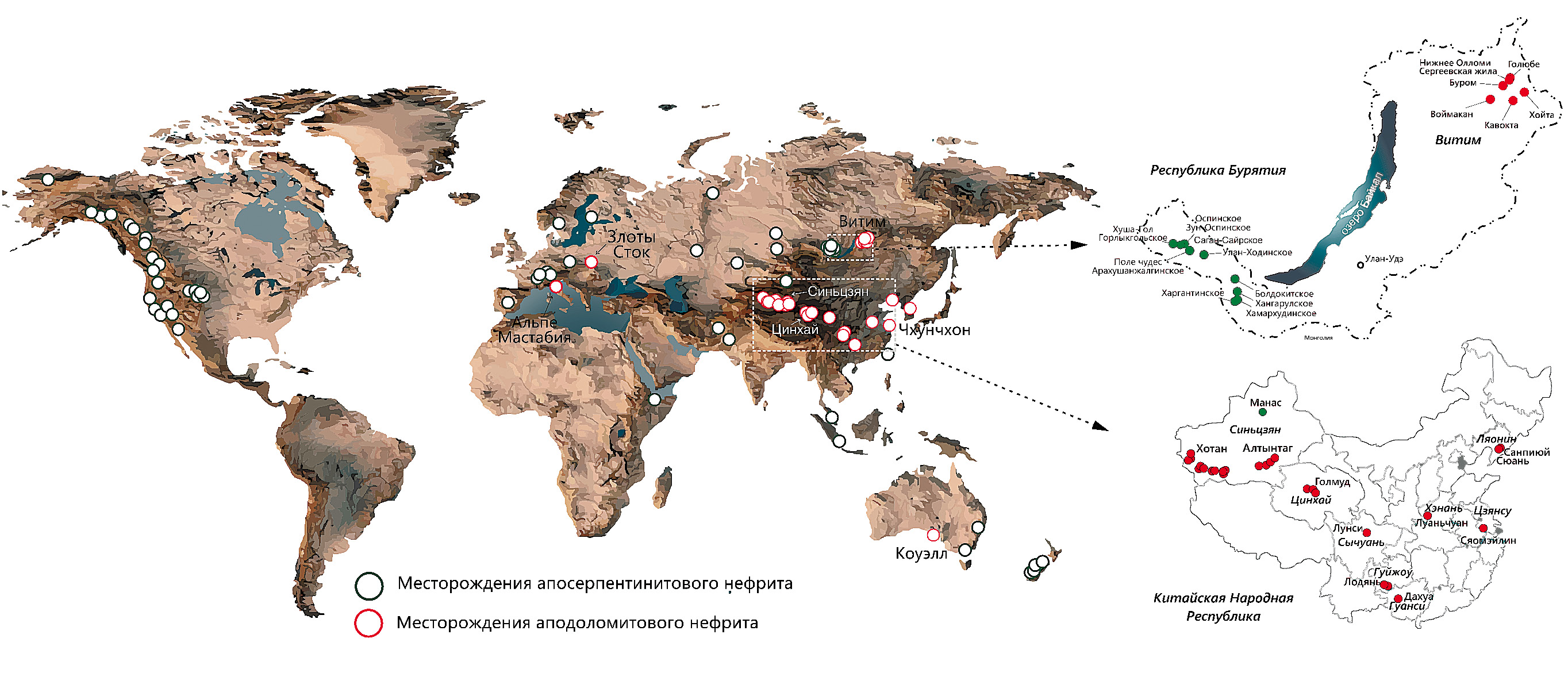 Фиг. 1. Месторождения нефрита в мире, Бурятии и Китае.