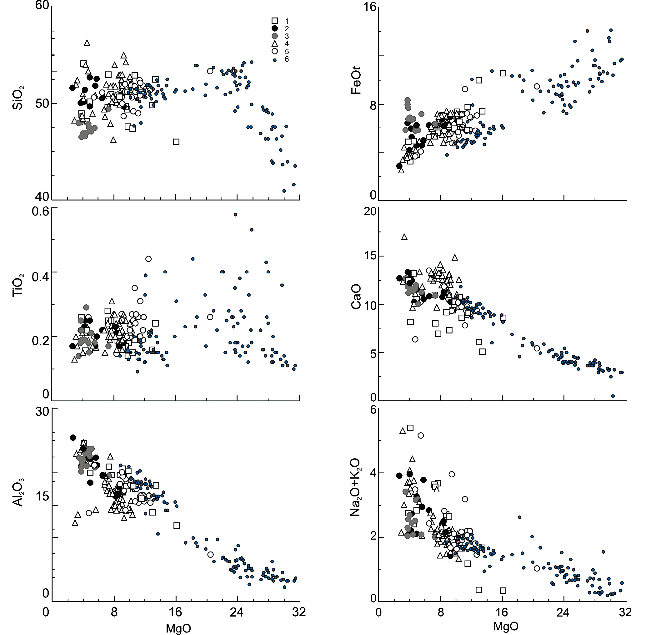 Фиг. 7. Диаграммы распределения петрогенных элементов в породах интрузии Вуручуайвенч (1–5) и массива Нюд (6): 1 – породы расслоенной зоны, залегающие стратиграфически выше ЭПГ рифа, 2 – “нормальный” ЭПГ риф, 3 – “потолевый” ЭПГ риф, 4 – породы расслоенной зоны, подстилающие ЭПГ риф, 5 – габбронориты нижней зоны ИВ (скв. 1226), 6 – нориты и габбронориты массива Нюд. FeO t – общее железо в пересчете на FeO.