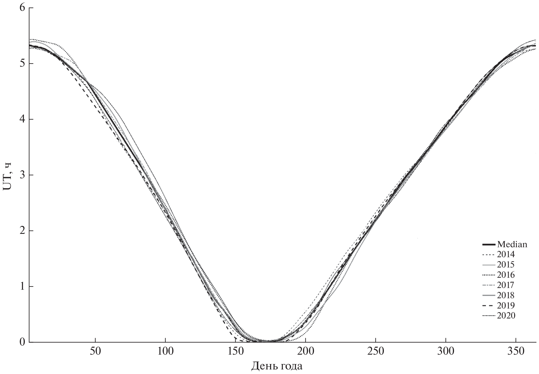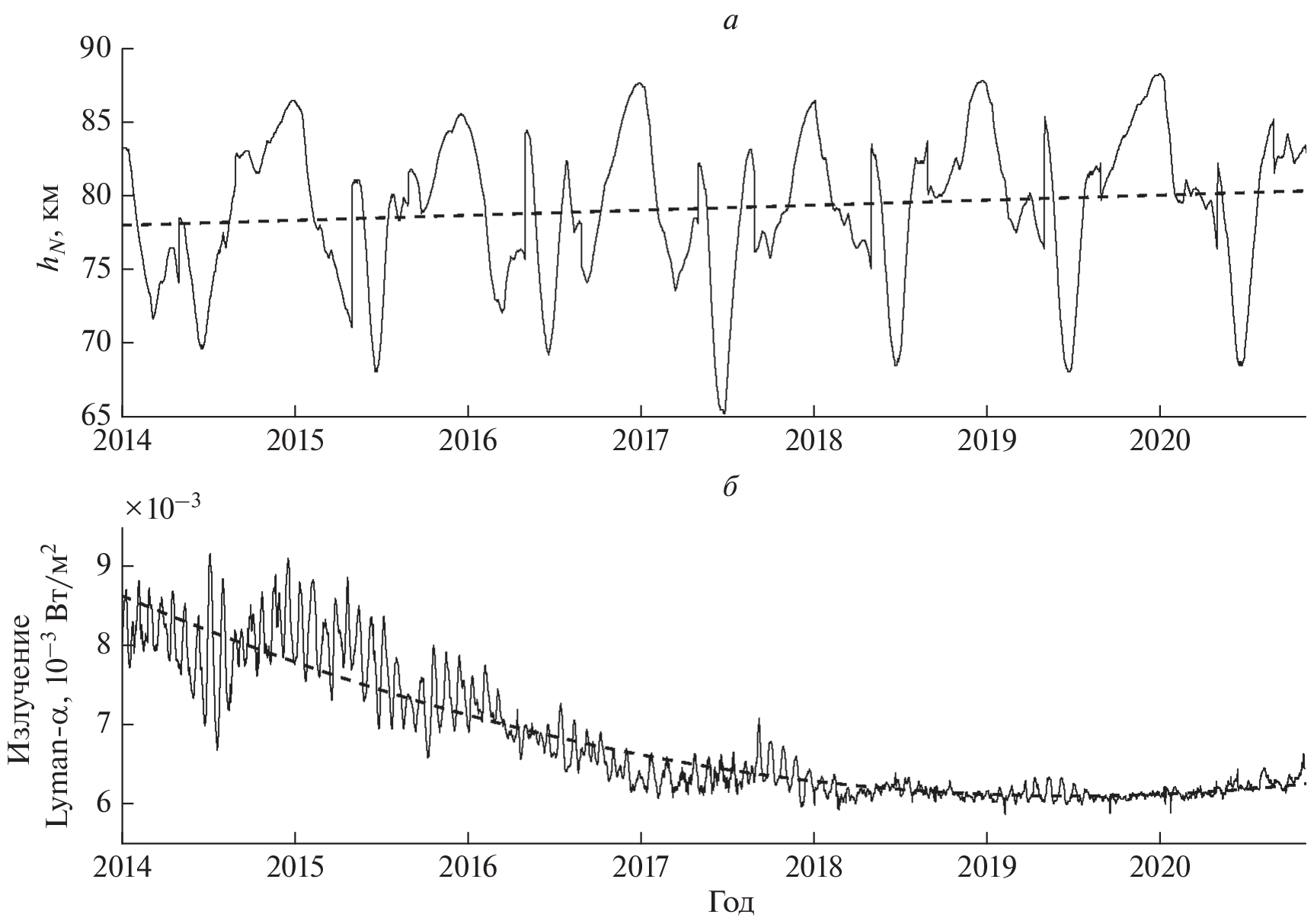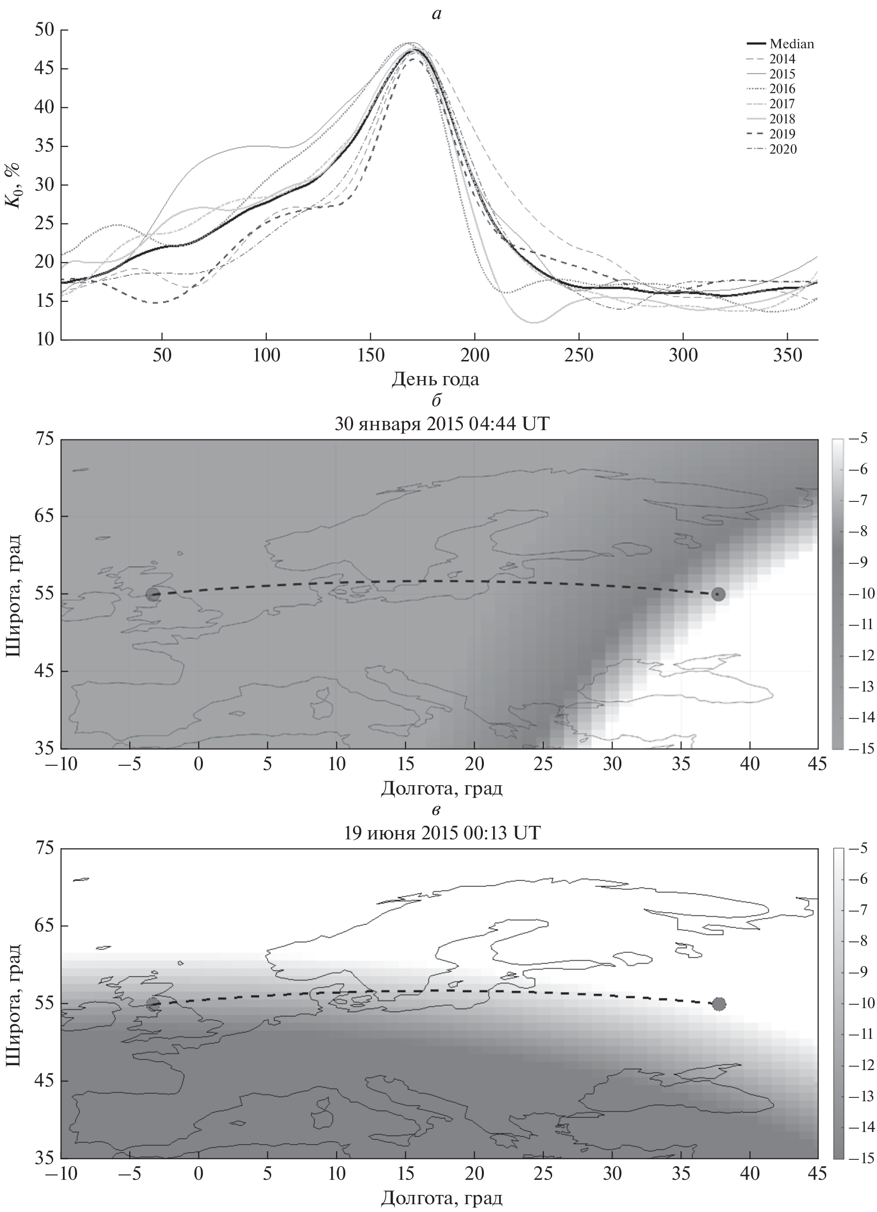 Обсуждается влияние освещенности трассы на амплитуду сверхдлинноволновых радиосигналов при прохождении солнечного терминатора. На основе многолетних измерений (с 2014 по 2020 г.) показано, что в зимний период резкое падение амплитуды сигнала на среднеширотных трассах происходит уже при освещении 15% длины трассы. Анализ вариаций амплитуды сверхдлинноволновых сигналов также позволил оценить высоту их отражения от верхней стенки неосвещенной части волновода hN (D – область ионосферы) и выявить сезонные и годовые вариации этой величины. Экспериментально обнаружен тренд увеличения hN примерно на 4 км за семь лет, вызванный спадом солнечной активности в этот период.