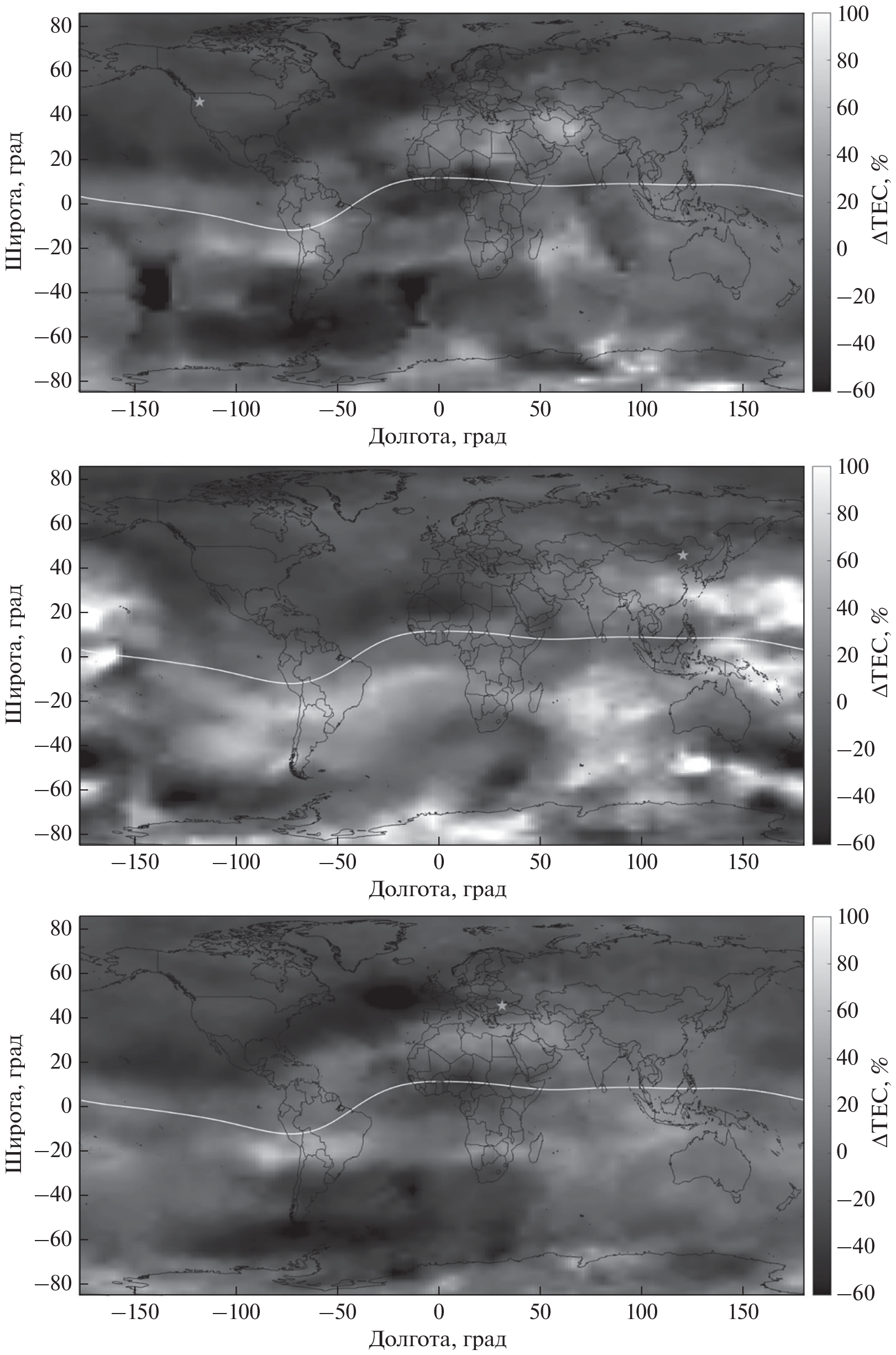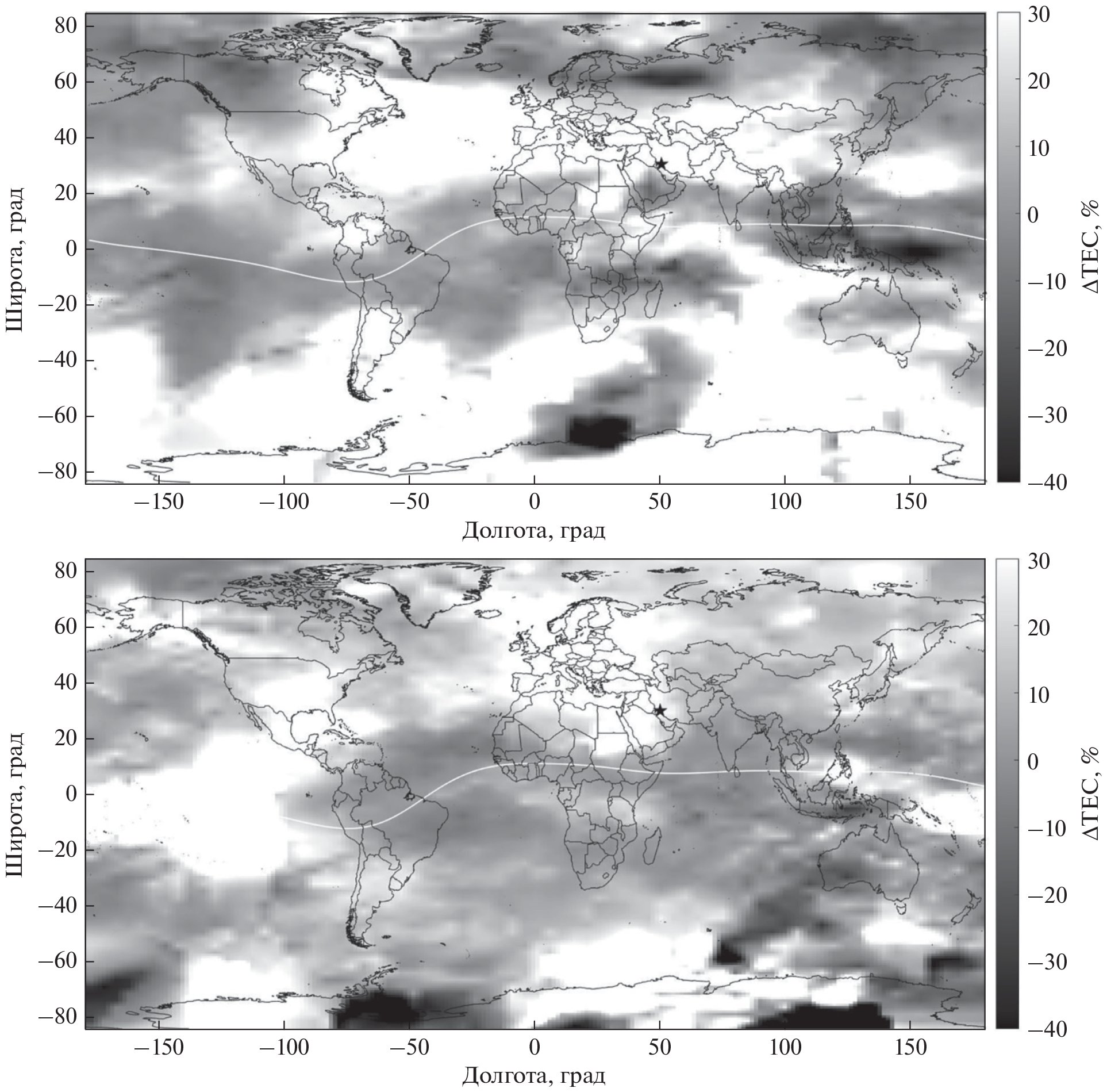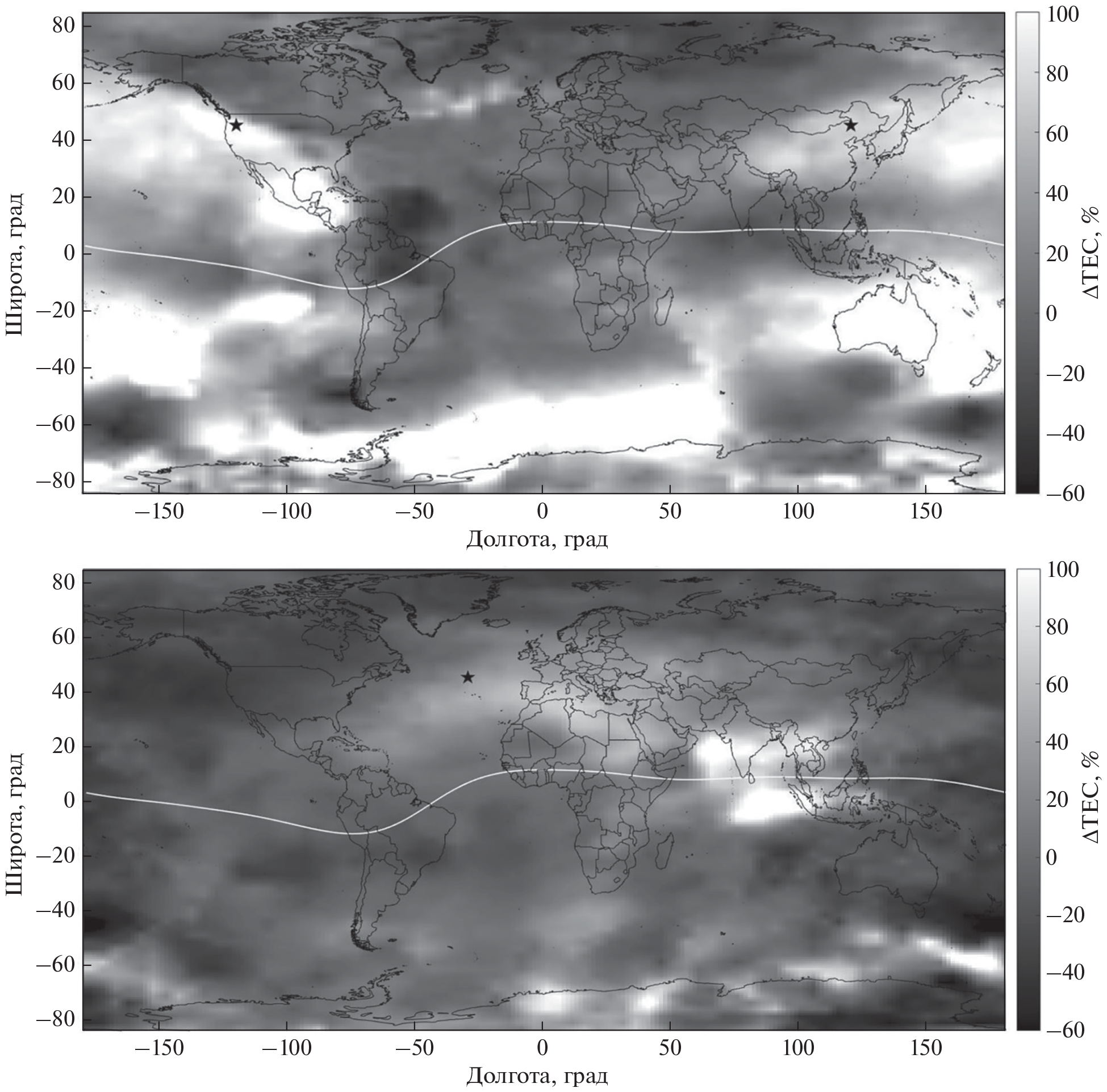 Рассмотрен глобальный отклик ионосферы на интенсивные геомагнитные бури и вариации солнечной активности по данным индекса солнечной активности F10.7. В качестве источника информации используются данные о полном электронном содержании (ПЭС), рассчитанные по измерениям мировой сети приемников глобальных навигационных спутниковых систем. В отличие от многих публикаций, где подробно исследуются эффекты отдельных уникальных геофизических событий (например, супербуря 28 октября 2003 г.), мы рассмотрели эффекты от сильных бурь (Dst ≤ –80 нТл) начиная с 2005 г. Главное внимание уделялось зависимости от времени начала главной фазы бури относительно местного времени/долготы, а также зависимости интенсивности отклика ионосферы от широты. Для отображения ионосферных эффектов магнитных бурь использовался визуальный образ – двумерное представление в формате сутки–местное время, использовавшийся для визуализации ионосферных предвестников землетрясений. Этот подход позволяет также визуализировать эффекты вариаций солнечной активности по данным индекса F10.7, а также отличить их от ионосферных вариаций во время геомагнитных бурь. В результате удалось создать обобщенный глобальный “портрет” геомагнитной бури в ионосфере Земли.