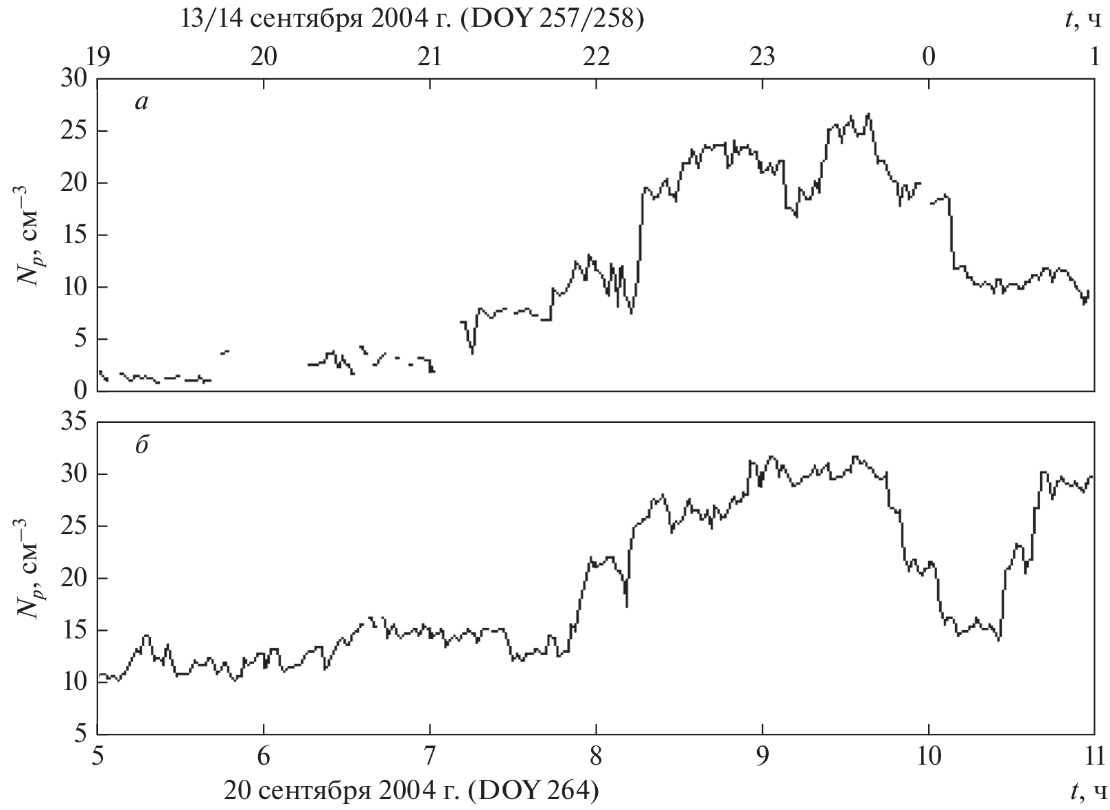 Представлены результаты экспериментов радиопросвечивания околосолнечной плазмы сигналами спутника Марса Mars Express. В области гелиоцентрических расстояний прицельной точки лучевой линии 8–13 солнечных радиусов измерялись флуктуации частоты просвечивающих радиосигналов. В ходе проведения экспериментов как на восточном, так и на западном лимбах зафиксированы резкие усиления дисперсии флуктуаций частоты. В измерениях вблизи орбиты Земли на космическом аппарате Wind в смежные периоды с запаздыванием на 5–17 сут регистрировались увеличения концентрации протонов и напряженности магнитного поля, которые в 7–15 раз превышают фоновые значения. Сравнение между данными, относящимися к внутреннему и околоземному солнечному ветру, позволяет сделать вывод, что наблюдавшиеся возмущения связаны с одной и той же вращающейся с Солнцем областью солнечной короны.