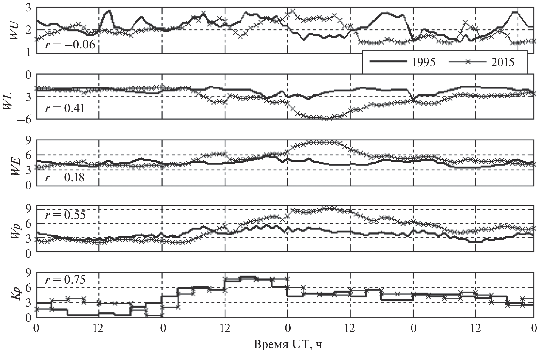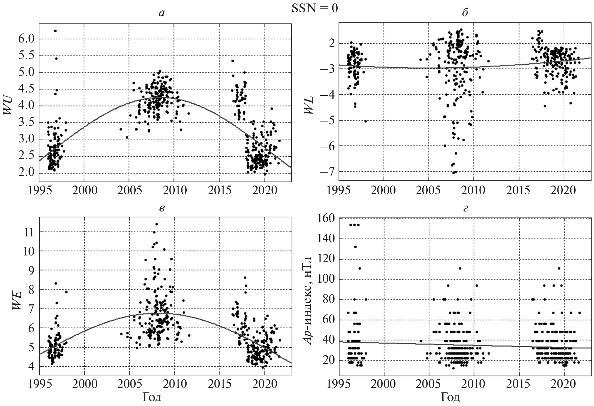Sun (Kp > 3.0) from 1995 to 2021. Variations of the global ionospheric indices WU (positive disturbances