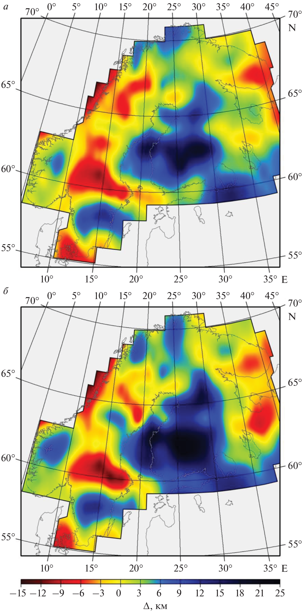 the Scandinavian Caledonides, the maximum (>45 km), under the Scandinavian Peninsula, in the west of