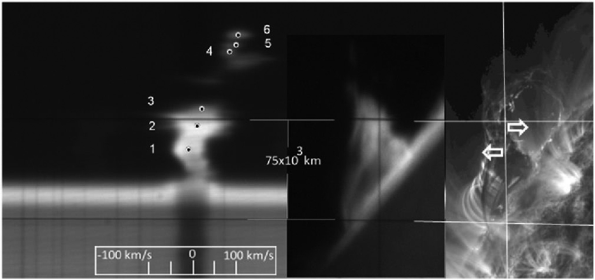 Рис. 1. Спектр Hα на момент 13:21:11 UT (слева). Цифры соответствуют фотометрическим разрезам. Внизу — шкала скоростей. В центре — изображение на щели в линии Hα. Справа — изображение SDO 304 Å с отмеченным положением щели спектрографа и доплеровскими компонентами скорости.