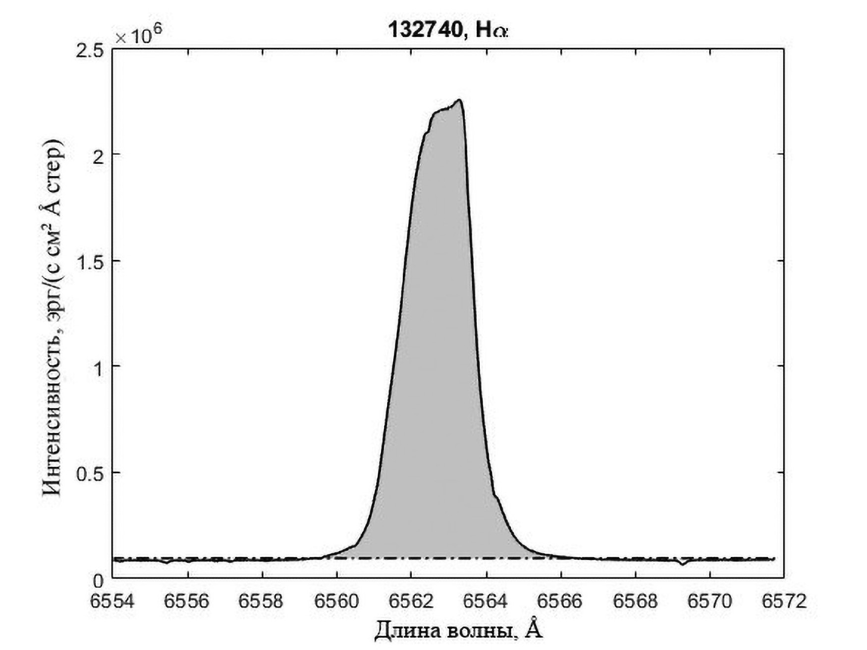 Рис. 3. Поток излучения (заштрихованная область) в линии Hα на момент 13:27:40 UT.