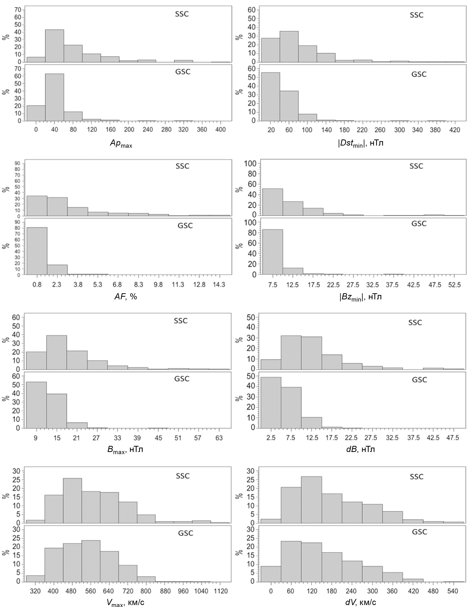 В табл. 1 для событий с внезапным и постепенным началом представлены медианы распределений: а) параметров геомагнитной и солнечной активности; б) параметров КЛ и межпланетных возмущений; в) параметров dB и dV, показывающих разницу между характеристиками возмущенного и спокойного СВ. На рис. 2 показаны гистограммы параметров Apmax, |Dstmin|, AF, |Bzmin|, Bmax, Vmax, dB, dV в группе FULL для событий с внезапным (SSC) и постепенным (GSC) началом. Из соображений масштаба для SSC-событий не показаны Форбуш-понижения: 2003.10.29 (AF = 28.0%, Vmax = 1800 км/c); 2003.10.30 (Vmax = 1876 км/c). Из рисунка видно, что распределения всех параметров (кроме Vmax и dV) характеризуются значительной положительной асимметрией независимо от характера начала события, а для SSC-событий имеют длинные “хвосты” в области бо́льших значений. Распределения Vmax и dV ближе к симметричным, что вообще характерно для скорости СВ [Мелкумян и др., 2018], и слабее отличаются между SSC- и GSC-событиями. Из табл. 1 видно, что |Dstmin| для спорадических ФП с внезапным началом (медиана = 78 нТл для СМЕ1 и 72 нТл для СМЕ2) существенно больше, чем для спорадических событий с постепенным началом (соответственно 37 и 34 нТл). В то же время для рекуррентных ФП характер начала события на величину |Dstmin| практически не влияет (медиана = 38 нТл для SSC и 33 нТл для GSC). Такое же поведение характерно для параметров КЛ (AF, Axymax, Azrange) и параметра |Bzmin|. У остальных параметров СВ как для спорадических, так и для рекуррентных ФП медианы распределений больше для SSC-, чем GSC-событий. Особенно большое отличие наблюдается для параметров dB и dV, показывающих разницу между характеристиками возмущенного и спокойного СВ. Таким образом, полученные результаты показывают: а) у большинства параметров распределения для SSC- и GSC-событий отличаются наличием “хвоста” в области бо́льших значений у ФП с внезапным началом; б) для спорадических ФП, медианы параметров КЛ, |Dstmin| и |Bzmin| больше для событий с внезапным началом; в) для рекуррентных ФП характер начала события на величину этих параметров практически не влияет; г) параметры Bmax, Vmax и особенно dB, dV больше для событий с внезапным началом для всех типов солнечных источников.