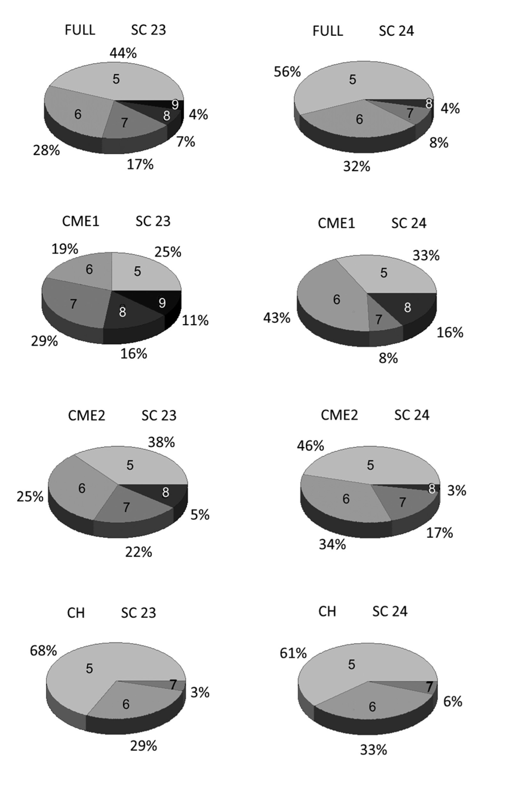 Рис. 3. Круговые диаграммы параметра Kpmax в группах FULL, CME1, CME2, CH для солнечных циклов 23 и 24 (Kpmax ≥ 5–).