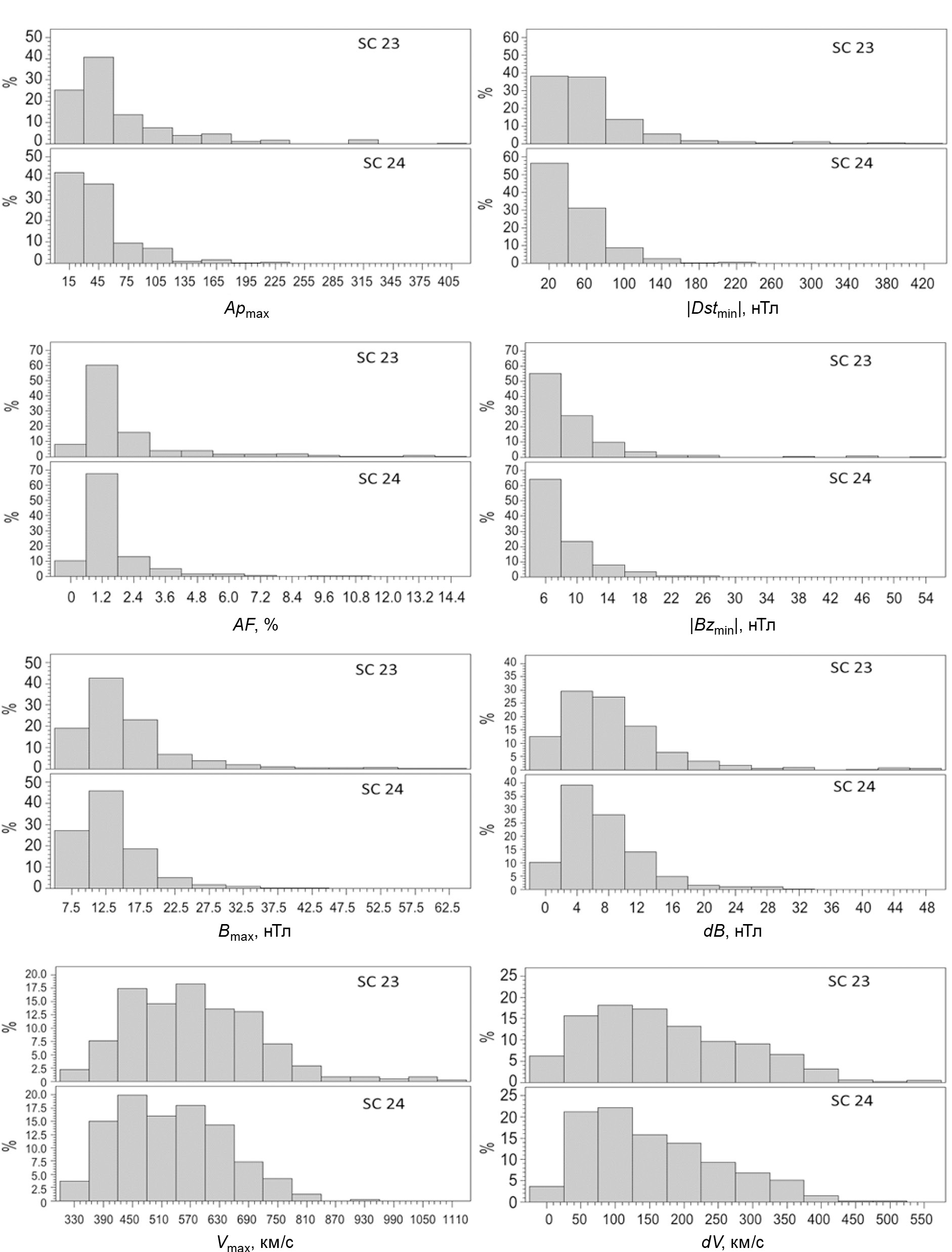 На рис. 4 показаны гистограммы параметров Apmax, |Dstmin|, AF, |Bzmin|, Bmax, Vmax, dB, dV для SC 23 и SC 24 в разных группах событий. Из соображений масштаба в группах FULL и CME1 в SC 23 не показаны события: 2003.10.29 (AF = 28.0%, Vmax = 1800 км/c), 2003.10.30 (Vmax = 1876 км/c). Из рисунка видно, что распределения всех параметров (кроме Vmax) характеризуются существенной положительной асимметрией в обоих солнечных циклах, а в SС 23 имеют длинные “хвосты” в области больших значений. Распределение Vmax близко к симметричному в обоих солнечных циклах, что характерно для максимальной скорости СВ [Мелкумян и др., 2018]. В табл. 5 представлены медианы распределений параметров солнечной и геомагнитной активности, СВ и КЛ в группах событий, связанных с разными типами солнечных источников, для солнечных циклов 23 и 24 (Bz < –5 нТл). Из таблицы видно, что медианы |Dstmin| и |Bzmin| для всех типов солнечных источников выше в SC 23, чем в SC 24, и в обоих циклах выше в группе СМЕ1, чем в группе СМЕ2 и тем более СН. В случаях, когда разница между медианами небольшая, мы проверили это соотношение, сравнив 95%-ные интервалы достоверности средних значений параметров. В SC 23 эти интервалы для |Bzmin| в группах СМЕ1 (11.05–14.21 нТл) и СМЕ2 (9.01–11.17 нТл) перекрываются, а для |Dstmin| интервал в группе СМЕ1 (86.7–117.1 нТл) лежит выше, чем в группе СМЕ2 (59.2–81.6 нТл). Таким образом, для спорадических событий в 23-м цикле значения |Bzmin| не зависят от типа солнечного источника (СМЕ1 или СМЕ2), а значения |Dstmin| выше для событий, связанных с выбросами массы из АО, т.е. ГА зависит не только от южной компоненты ММП, но и от других параметров СВ. В SC 24 интервалы достоверности в группах CМЕ1 и СМЕ2 перекрываются и для параметра |Bzmin| (CME1: 8.97–11.53нТл, СМЕ2: 8.39–10.23нТл), и для параметра |Dstmin| (CME1: 52.2–74.6нТл, СМЕ2: 41.5–60.7нТл). Так как общий уровень параметров межпланетных возмущений в цикле 24 существенно ниже [Gopalswamy et al., 2020], то, возможно, влияние остальных параметров CB (кроме Bzmin) в этом цикле ослабевает. Что касается рекуррентных ФП, то значения параметров |Dstmin| и |Bzmin| для этих событий в среднем меньше, чем для спорадических, в обоих солнечных циклах. Сравнивая интервалы достоверности параметров внутри каждой из групп спорадических событий между двумя циклами, получаем: а) разница между средними значениями |Bzmin| в SC 23 и в SC 24 статистически незначима; б) для событий, связанных с выбросами массы из АО, средние значения |Dstmin| выше в SC 23; в) для событий, связанных с волоконными выбросами вне АО, средние значения |Dstmin| одинаковы в обоих циклах.
