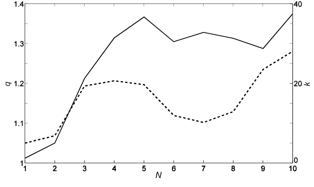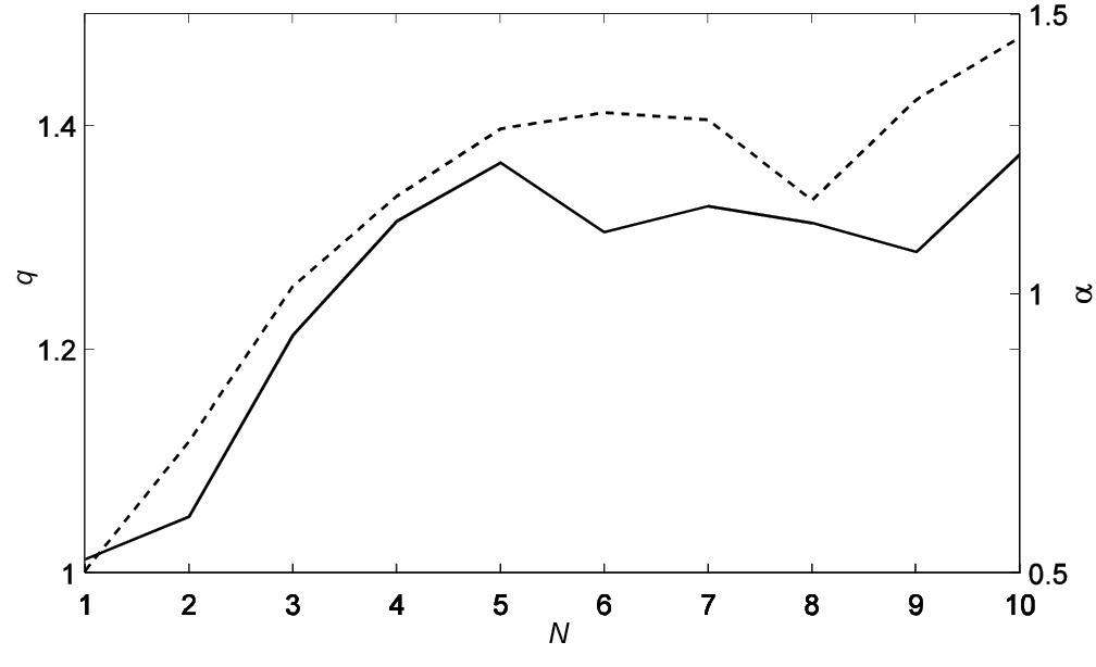 Рис. 5. Изменения значений параметра q (сплошная линия, ось ординат слева), и скейлинга (пунктирная линия, ось ординат справа), во время авроральной активности. N — номер набора.