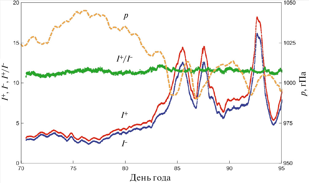 Рис. 1. Вариации концентраций положительных I+и отрицательных I— ионов (в 103 см−3), отношения их концентраций (10 I+/I-) и атмосферного давления, приведенного к уровню моря, за 12 марта — 6 апреля 2022 г. Дни отсчитываются от начала года.