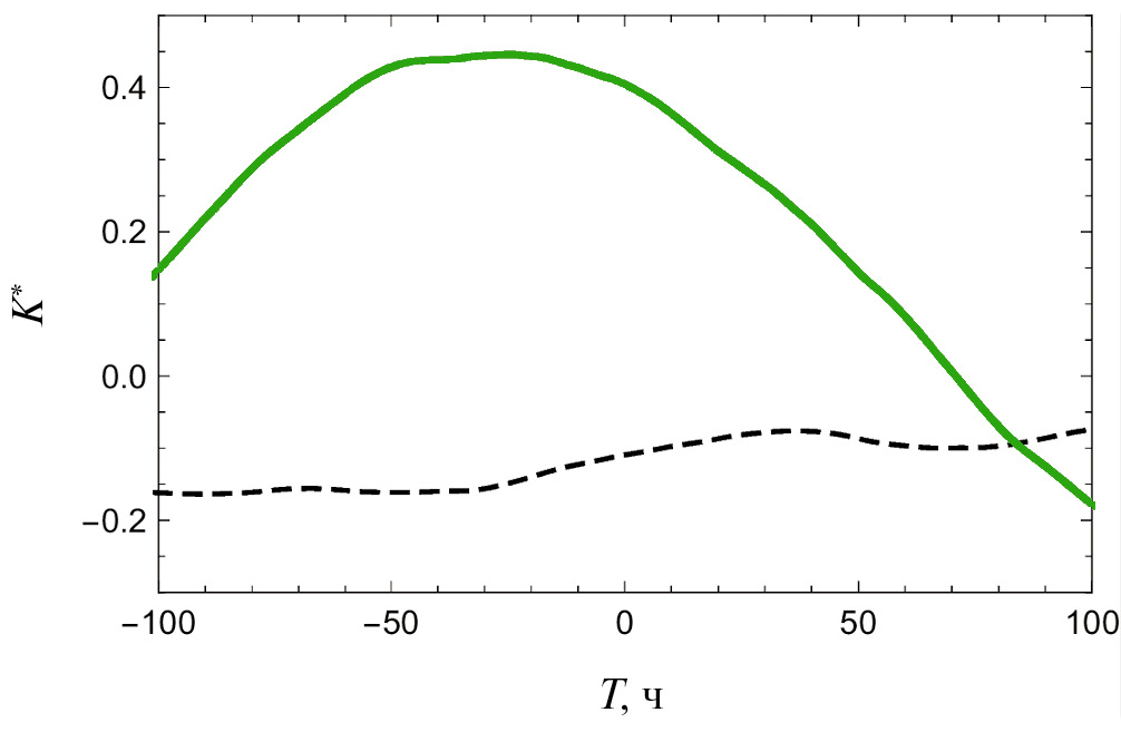 Использование решения (14) в численном расчете корреляционной функции (2) показывает (см. рис. 3), что результат для модели (13) мало отличается от результата расчета в рамках модели (7). В обоих случаях имеется максимальная антикорреляция при T ∼ 2 сут. При других T корреляционые кривые близки между собой по форме, но во второй модели нормировочный коэффициент на 19% больше, т.е. меньше влияние случайных помех в измерениях.