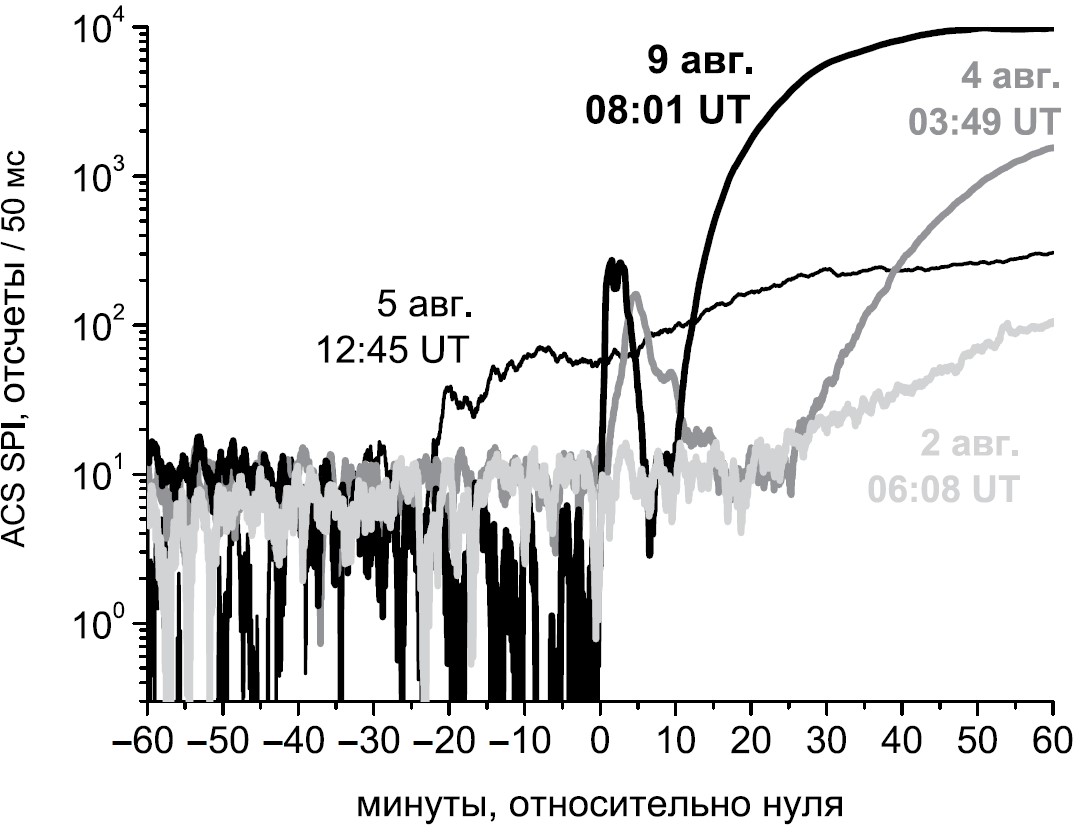 На рис. 3 показаны кривые темпа счета ACS SPI за 50 мс (сглаженные средние за 1 мин, фон вычтен) относительно указанного нулевого времени UT 2 августа (светло-серая кривая), 4 августа (серая кривая), 5 августа (тонкая черная кривая) и 9 августа (черная кривая) 2011 г. Протонные возрастания 2 и 4 августа с квазимаксимальной энергией 120 и 500 МэВ наблюдались позднее 20 мин и соответствуют “медленному” ускорению электронов. Протонное возрастание 9 августа с квазимаксимальной энергией 650 МэВ — раннее (менее 20 мин) и соответствует “быстрому” ускорению [Григорьева и др., 2023], оно показало наибольшее возрастание темпа счета ACS SPI первый час после нуля. Событие 9 августа 2011 г. не дало GLE, так как не хватило времени для ускорения необходимого числа протонов с энергией выше порога атмосферного обрезания [Григорьева и Струминский, 2022].
