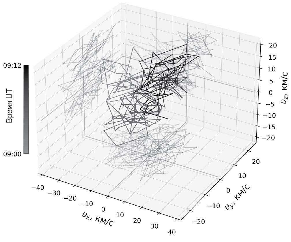 Для расчета коэффициента вихревой диффузии использовались данные измерений гидродинамической скорости ионов плазмы приборами FPI/DIS спутниковой миссии MMS [Pollock et al., 2016] с временным разрешением 1/4.5 c−1. Активная флуктуация компонент гидродинамической скорости плазмы в плазменном слое хвоста магнитосферы выявлена при построении трехмерных годографов гидродинамической скорости. Пример полученного годографа показан на рис. 1 для интервала 09:00—09:12 25 мая 2017 г.