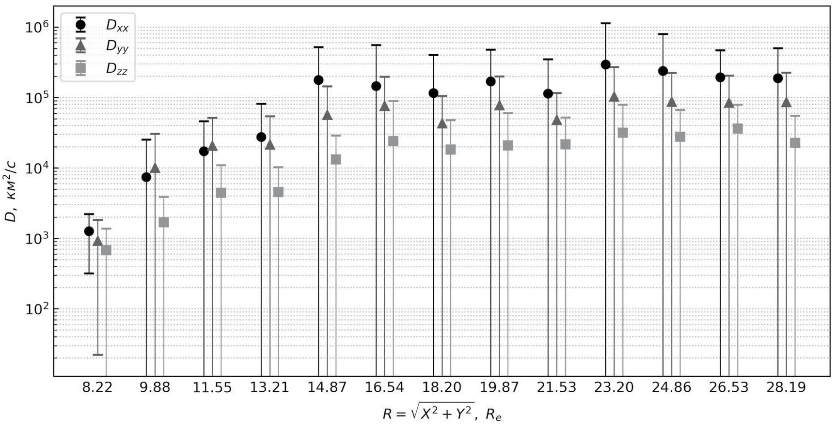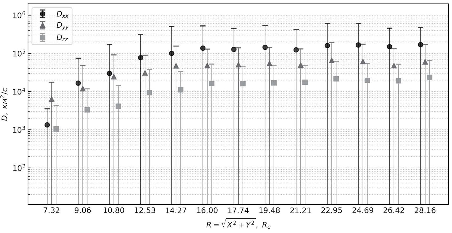 Для радиальных профилей компонент вихревой диффузии (см. рис. 3—6) характерно увеличение значений коэффициентов с ростом геоцентрического расстояния до ~14RE с последующим выходом на плато. Данная закономерность подтверждает выводы работ о проецировании аврорального овала на внешнюю часть кольцевого тока, а не на собственно плазменный слой, где постоянно высок уровень турбулентности. Как известно, на широтах аврорального овала в магнитоспокойных условиях могут наблюдаться почти стационарные вихри, приводящие к формированию авроральных структур типа перевернутого V [Antonova and Ovchinnikov, 1998] и стабильные авроральные дуги. В целом закономерность близка к результатам [Stepanova et al., 2009, 2011; Pinto et al., 2011], но получена на большей статистике.