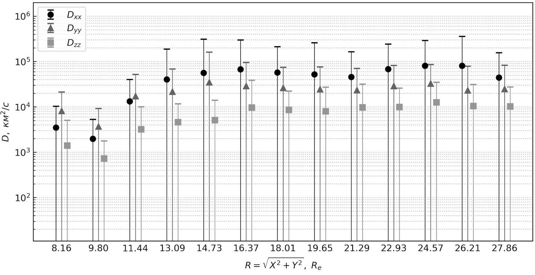 По полученному массиву данных для двух направлений ММП были построены распределения диагональных компонент коэффициентов вихревой диффузии в зависимости от GSM X- и Y-координат в плазменном слое магнитосферы и определены усредненные радиальные профили коэффициентов диффузии (рис. 3, 4), а также были рассчитаны средние значения диагональных компонент коэффициента вихревой диффузии.