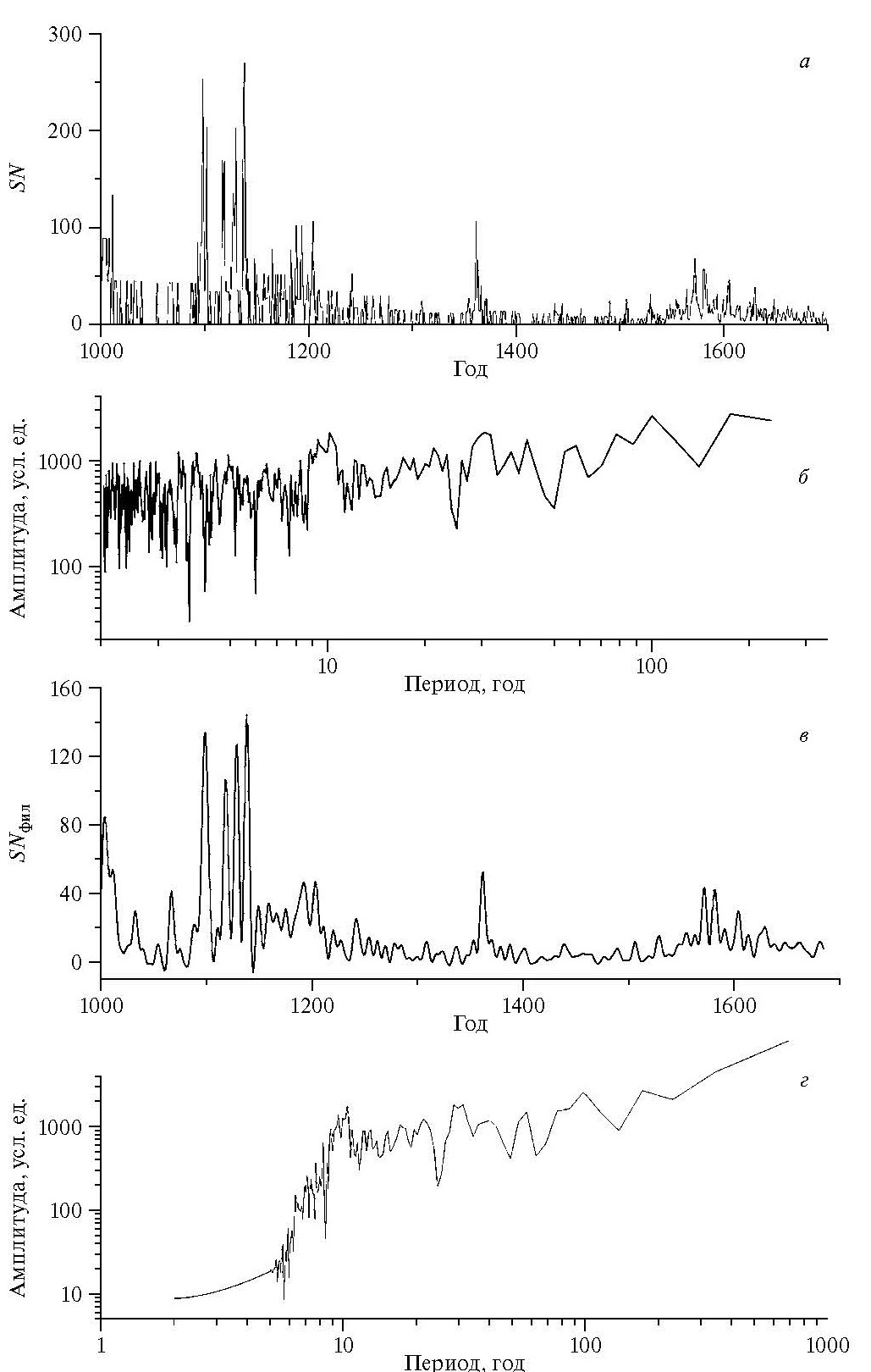 Далее сравним полученный ряд SNфил (рис. 2а) с реконструированным рядом SN14C (рис. 2б). Несмотря на систематическую разницу в амплитудах, кривые SNфил и SN14C демонстрируют общие характерные черты изменения СА во времени: наличие в 1000—1700 гг. длительных отрезков (~50—150 лет) с пониженным уровнем активности (рис. 2а, 2б) — гранд-минимумами, которые перемежаются отрезками повышенной активности — гранд-максимумами.