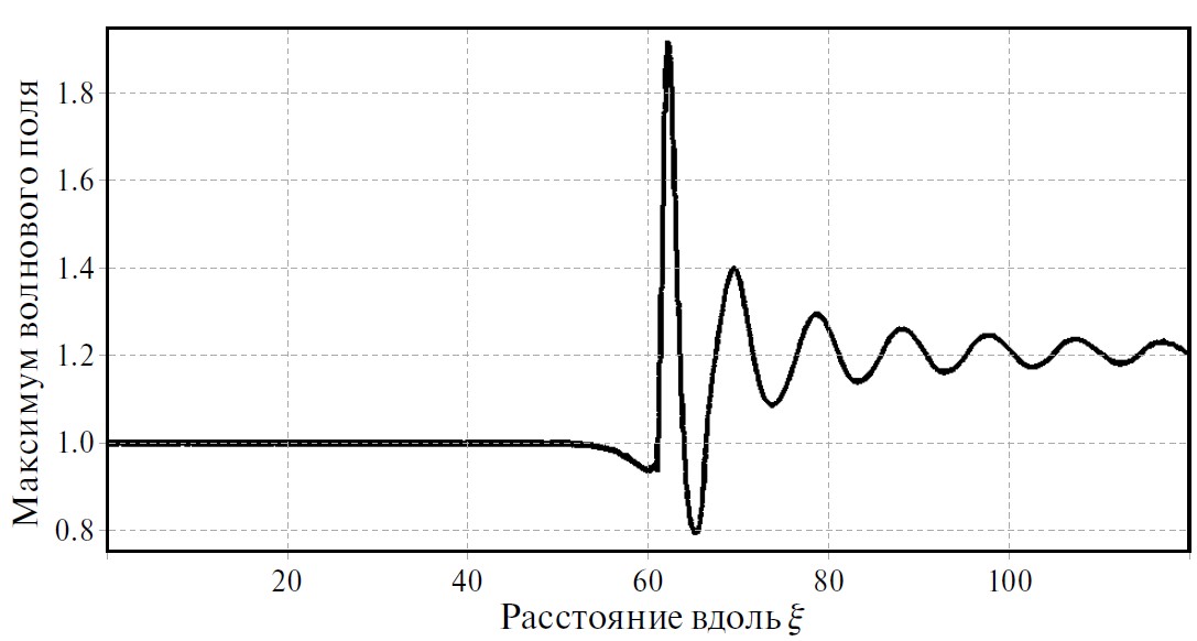 На рис. 3 приведена зависимость максимума амплитуды волнового поля от расстояния ξ. Такая зависимость наблюдается в диапазоне 1.5 < v0 / A < 2.5. В этом диапазоне при → ∞ волновое поле сосредоточено в окрестности η = 0. Заметим, что для керровских солитонов в этой области η = 0, → ∞ амплитуда поля равна нулю, так как пучки расходятся из области взаимодействия. На этом рисунке можно наблюдать, как колеблется объединенный пучок, тем не менее, амплитуда устанавливается на уровне, примерно на 20% выше исходного пучка.