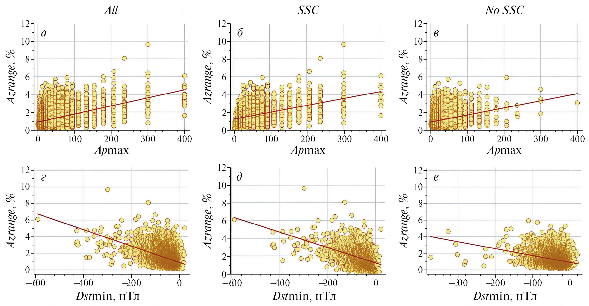 В табл. 2 также приведены коэффициенты корреляции и коэффициенты линейной регрессии для величин индексов ГА (Apmax и Dstmin) и величин четырех характеристик КЛ (для частиц с жесткостью 10 ГВ): AF, Dmin, Axymax и Azrange для трех групп событий (All – все события, SSC – входящие в группу All события с внезапным началом (1838 событий), No SSC – входящие в группу All события без внезапного начала – 6686 событий). Самые высокие коэффициенты корреляции наблюдаются в группе событий с внезапным началом.
