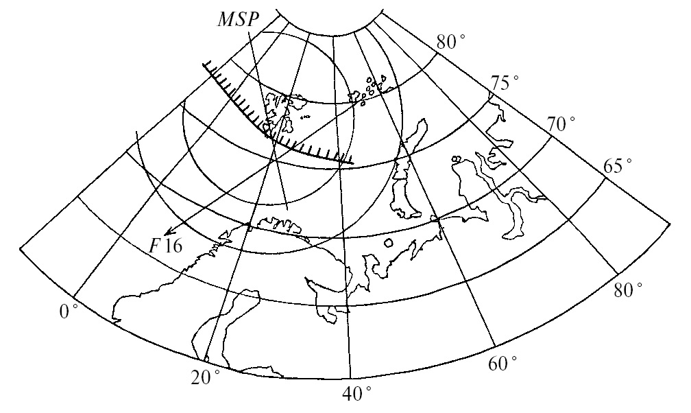 Рис. 1 иллюстрирует положение RA в 09:01:50 UT, что примерно соответствует времени пролета спутника F16 над лучистой дугой сияний. Траектория спутника F16 показана сплошной линией со стрелочкой, которая указывает направление полета. Данные спутника F16 взяты на страницах (http://sd-www.jhuapl.edu). Спутник имел почти круговую полярную орбиту с высотой ~835 км и периодом обращения ~101 мин. Каждую секунду спутник регистрировал спектр высыпающихся частиц в диапазоне энергий от 32 эВ до 30 кэВ в 19-и каналах, распределенных по энергиям в логарифмической последовательности.