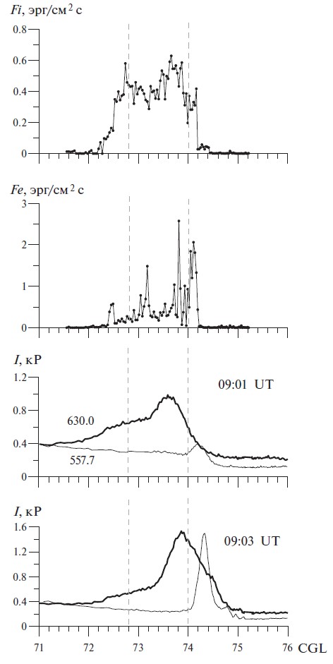Сверху вниз на рис. 5 представлены потоки энергии высыпающихся ионов (Fi) и электронов (Fe), а ниже интенсивности свечения эмиссий (OI) 630.0 нм (жирная кривая) и (OI) 557.7 нм (тонкая кривая) в 09:01 UT и 09:03 UT. По горизонтальной оси отложена исправленная геомагнитная широта. Для определения широты по величине зенитного угла наблюдения высота свечения принималась равной 150 км для эмиссии 557.7 нм и 240 км для эмиссии 630.0 нм. Вертикальными штриховыми линиями на рисунке показано положение экваториальной и приполюсной границ каспа.