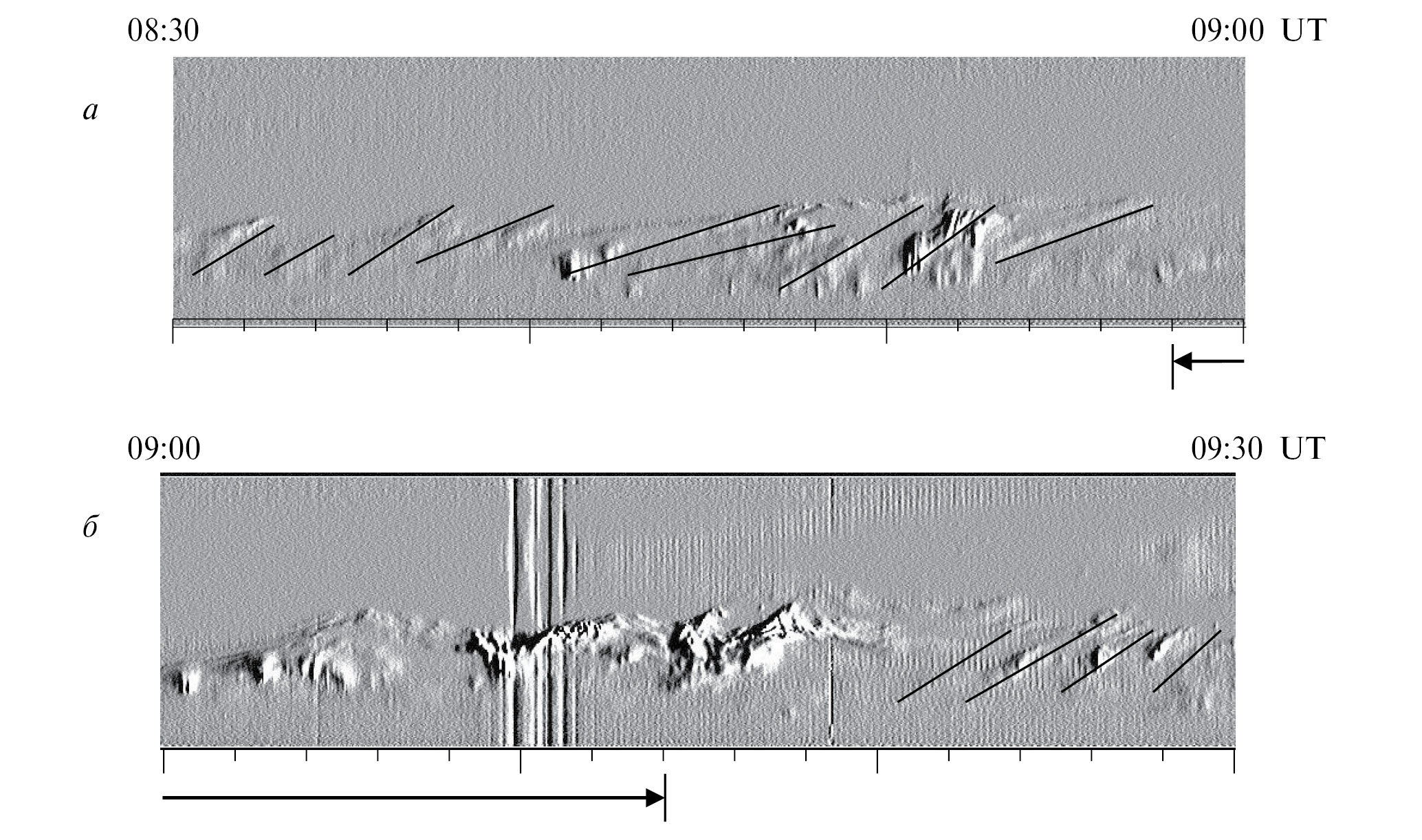 На рис. 6 представлена градиентная кеограмма сияний в интервалах 08:30‒09:00 UT (рис. 6а) и 09:00 – 09:30 UT (рис. 6б). Кеограмма показывает временное поведение аврорального свечения вдоль геомагнитного меридиана, полученное в интегральном свете по наблюдениям камеры всего неба. По вертикальной оси отложен зенитный угол, верх кеограммы соответствует направлению на геомагнитный север. Зенит обсерватории наблюдения находится в центре кеограммы. Градиентная кеограмма выполнена методом, основанным на выделении пространственно-временных и яркостных градиентов, и позволяет выявлять тонкие эффекты в динамике форм сияний и вариациях яркости свечения [Корнилов и Корнилов, 2003].