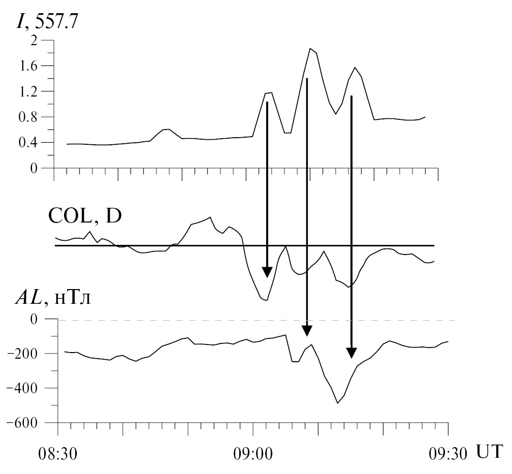 В верхней части рис. 7 показаны вариации максимального значения интенсивности эмиссии 557.7 нм (I557.7) по наблюдениям MSP в интервале 08:30 – 09:30 UT. Фактически рисунок иллюстрирует изменения интенсивности свечения наиболее яркой дискретной формы сияний на меридиане обсерватории. Из рис. 7 видно, что интенсивность свечения дискретных форм сияний в зеленой линии (OI) меняется от 0.4 кР до 1.8 кР, показывая три ярко выраженных максимума в интервале положительных значений Bz-компоненты ММП. Попытки найти причины таких вариаций в изменениях параметров внешнего воздействия не привели к положительным результатам, так как ни в ММП, ни в параметрах плазмы солнечного ветра таких вариаций не обнаружено. Наблюдается некоторая корреляция между I557.7 и уровнем магнитной активности в полуночном секторе авроральной зоны. В нижней части рис. 7 показаны вариации D-компоненты магнитного поля в обсерватории Колледж (Аляска, США) и AL-индекса магнитной активности. В ночном секторе наблюдалось несколько вспышек магнитной активности, в том числе две небольшие магнитосферные суббури интенсивностью в AL-индексе примерно –300 нТл и –500 нТл. Возмущение в D-компоненте на обсерватории Колледж, предшествующее этим вариациям, вероятнее всего, связано с суббуревой активностью, протекающей западнее Колледжа, где отсутствуют магнитные станции AL-индекса. Сплошные вертикальные линии со стрелками на рис. 7 нанесены так, чтобы отметить возможную связь между интенсивностью свечения дискретных форм дневных сияний и суббуревой активностью в полуночном секторе. Ниже мы обсудим возможные причины таких вариаций.