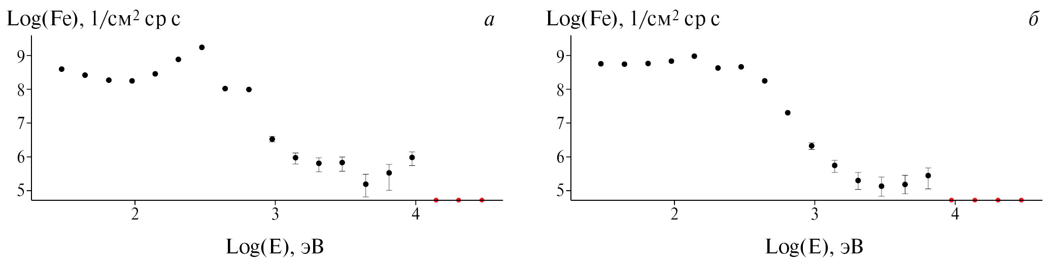 Рис. 8. Спектры высыпающихся электронов в области лучистой дуги сияний, зарегистрированные в (а) 09:01:47 UT ‒ на широте 74.1° CGL и (б) ‒ в 09:01:49 UT на широте 74.0° CGL.