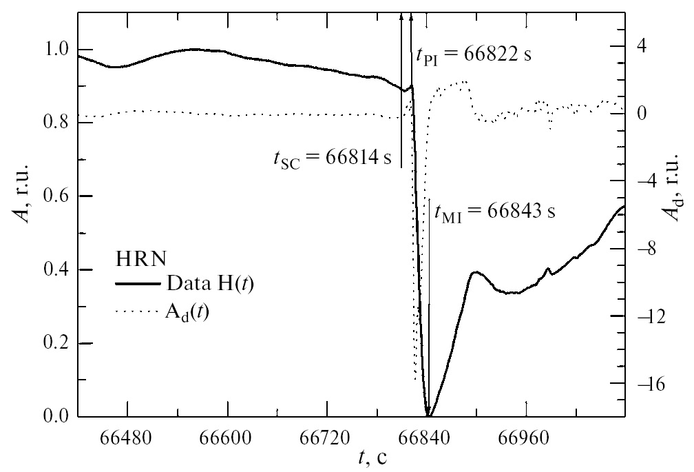 Как было сказано выше, для некоторых магнитных обсерваторий (речь идет, прежде всего, о высокоширотных станциях) в исследуемых SC-событиях основному импульсу предшествовал предварительный обратный импульс PI. Рассмотрим пример такого события по данным наблюдений магнитной станции HRN (см. рис. 3). Момент времени tSC на рис. 3 определен как начало небольшого роста Hn(t) непосредственно перед началом резкого спада интенсивности горизонтальной H-компоненты поля. Момент начала регистрации PI находился по скачку производной Hd(t). Момент начала регистрации MI tMI магнитной станцией определен как момент начала последующего резкого нарастания значений Hn(t).