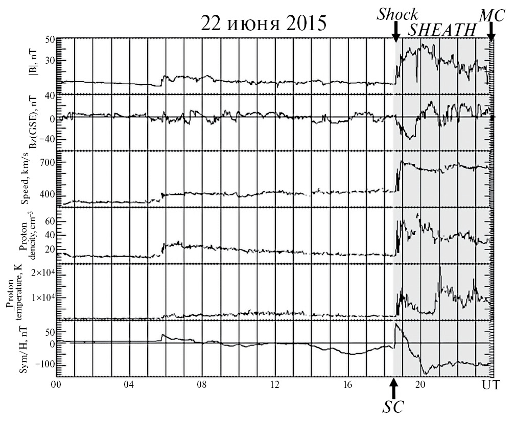 На рис. 4 и рис. 5 показаны условия в межпланетном магнитном поле (ММП) и в солнечном ветре, а также геомагнитная активность на Земле, выраженная индексом SYM-H, связанная с появлением SC от 22 июня 2015 г. и 16 июля 2017 г., соответственно. Момент времени регистрации МУВ, а также области ударно-сжатой плазмы за фронтом ударной волны (SHEATH) и передняя граница магнитного облака (МС), отмеченные на рисунках стрелками, указаны согласно классификации событий в солнечном ветре в каталоге [Ермолаев и др., 2009]. МС для SC-события от 22 июня 2015 г. начинается с началом новых суток, поэтому на рис. 4 его передняя граница указана условно.