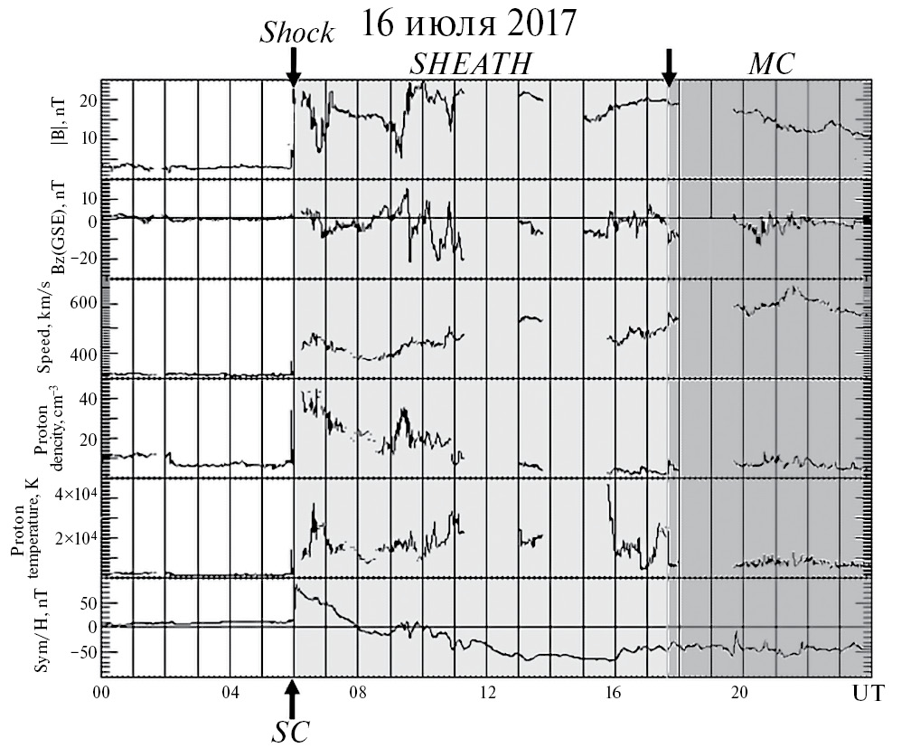 Рис. 5. То же, что и на рис. 4, но для 16 июля 2017 г., когда на земной поверхности наблюдались SSC, вызванные приходом межпланетной ударной волны КВМ с источником формирования в Южном полушарии Солнца 14 июля 2017 г. в 01:25 UT.