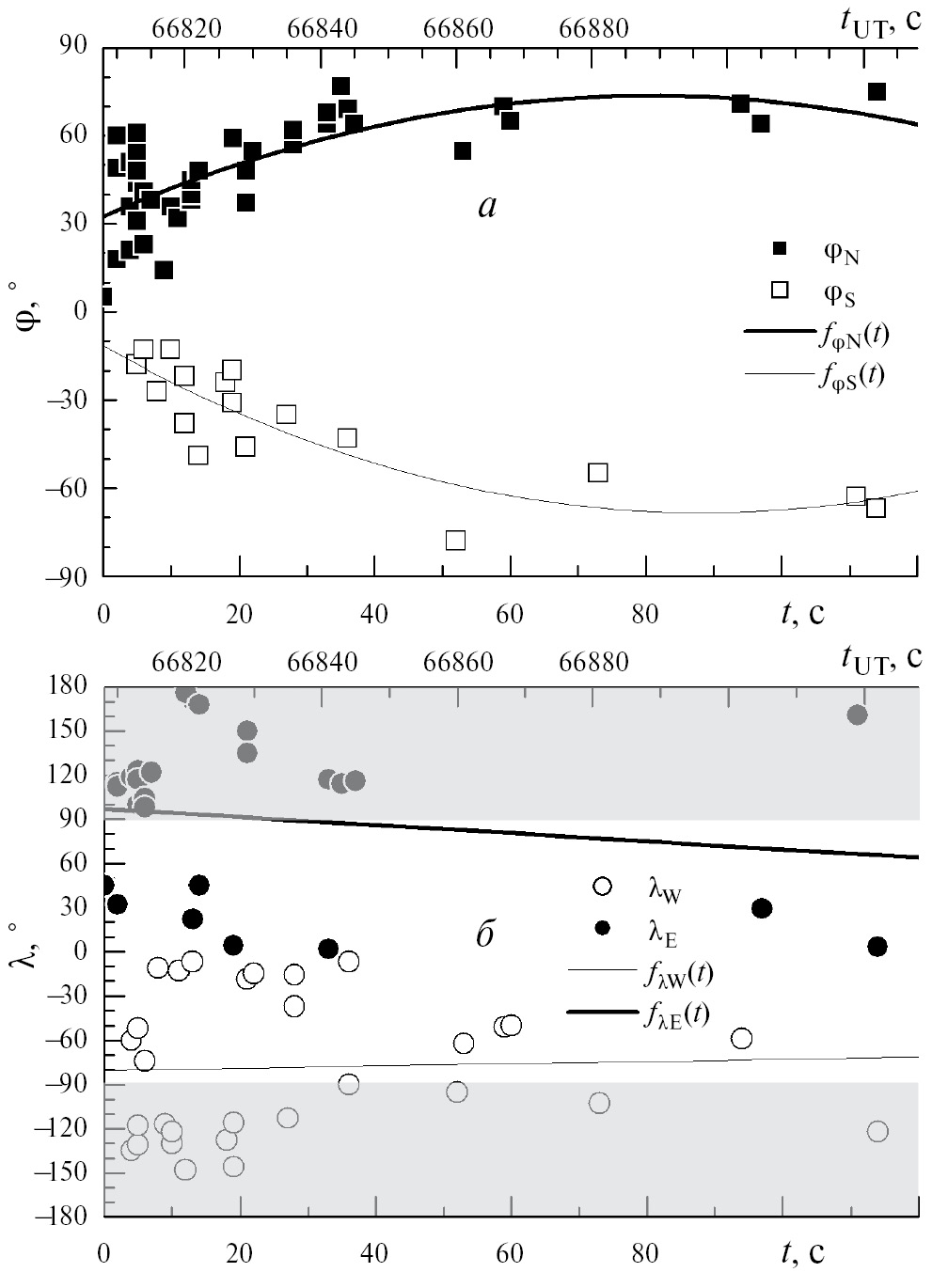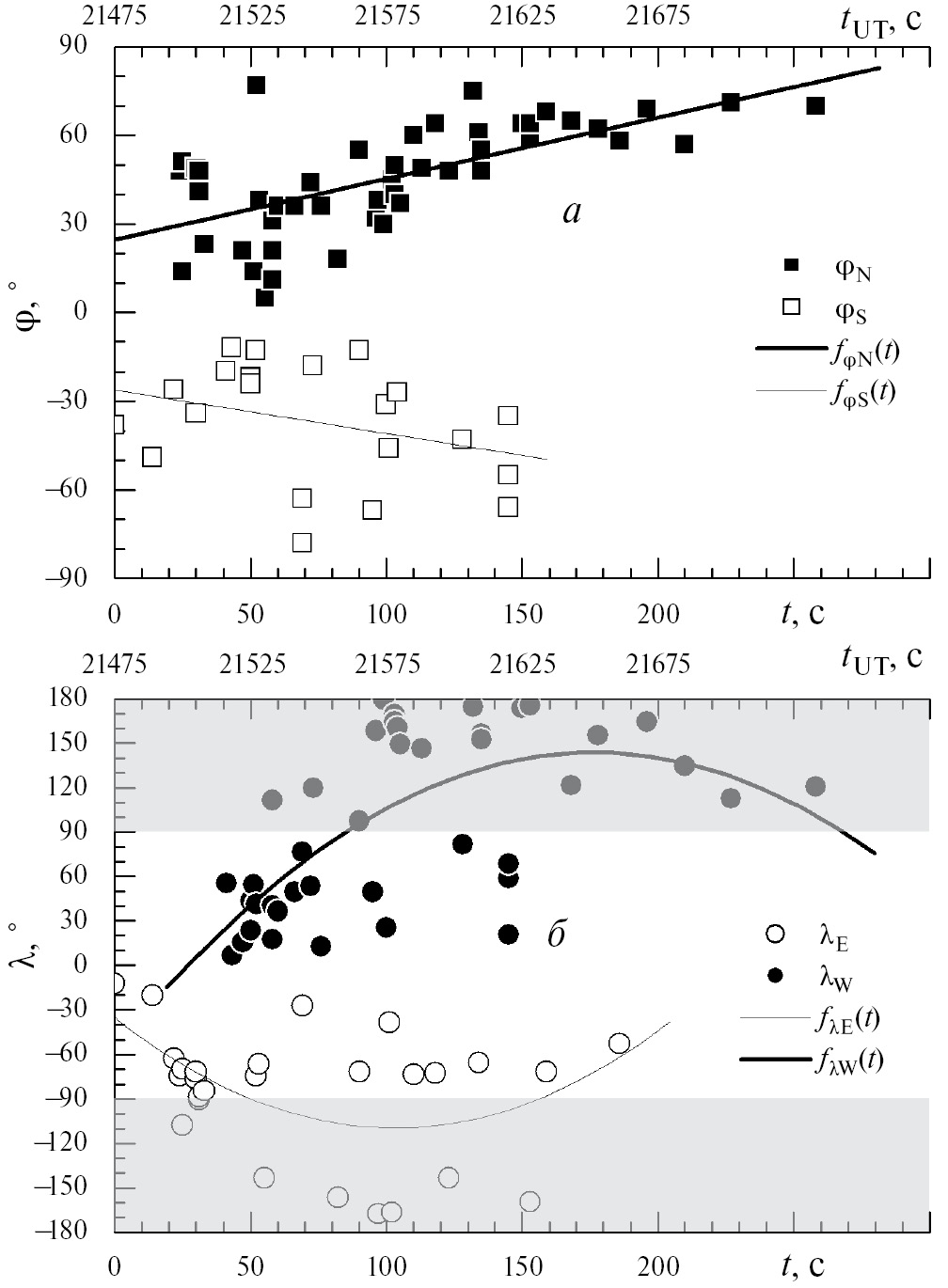 На зависимостях разности географической долготы станции и “полуденной линии” λ от момента начала регистрации SC во всех случаях наблюдается слабый квадратичный тренд, причем более слабый для станций на долготах восточнее “полуденной линии” (см. рис. 8б). Так, для станций, расположенных на момент начала SC на долготах восточнее “полуденной линии” – fλE(t) = 0.039·t2 – 2.9156·t –52.885 (коэффициент корреляции r = –0.42), западнее – fλW(t) = –0.0478·t2 + + 5.8656·t – 47.144 (коэффициент корреляции r = 0.67). На рис. 8б видно, что станция AMS на момент наблюдения SC-события находилась в долготном секторе ∆λ от 0° до –90°, т.е. на освещенной Солнце восточной части полушария Земли. Спустя ~160 с с момента начала регистрации SC на станции AMS все станции, находящиеся западнее “полуденной линии”, находились на ночной стороне Земли. В то время как на станциях, находящихся восточнее “полуденной линии”, наблюдалось утреннее время (вблизи восхода Солнца).