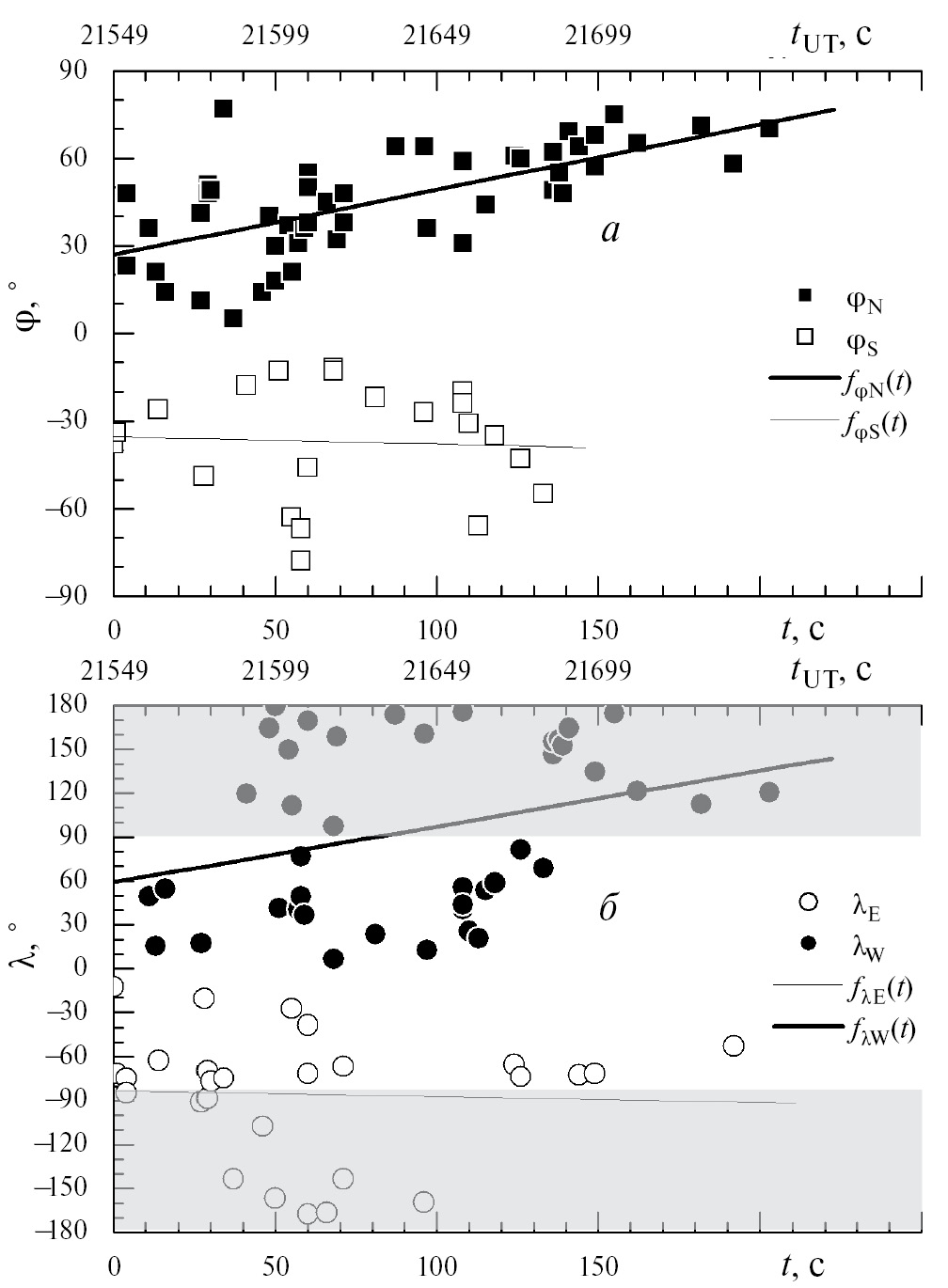 На графиках регистрации MI как функции разности географической долготы станции и “полуденной линии” λ и времени t, можно выделить только слабые линейные тренды (см. рис. 9б). Так, для станций, расположенных на момент начала SC-события на долготах восточнее “полуденной линии” – fλE(t) = 0.3812·t +59.077 (коэффициент корреляции r = 0.31), западнее – fλW(t) = –0.0398·t – 83.11 (коэффициент корреляции r2 = –0.05). Через ~150 с начало момента регистрации MI на станции AMS все станции, находящиеся западнее “полуденной линии”, находились на ночной стороне Земли. Тогда как местное время на станциях, находящиеся восточнее “полуденной линии” к этому моменту времени, соответствовало утренним часам.