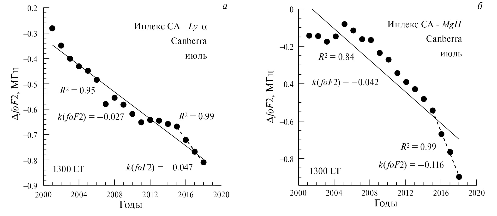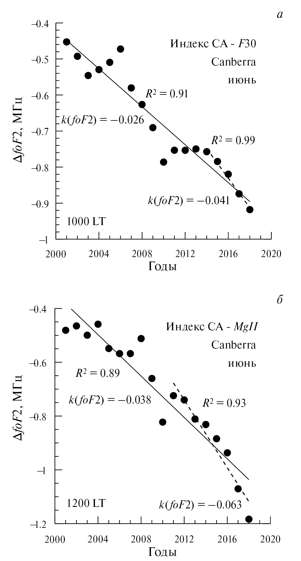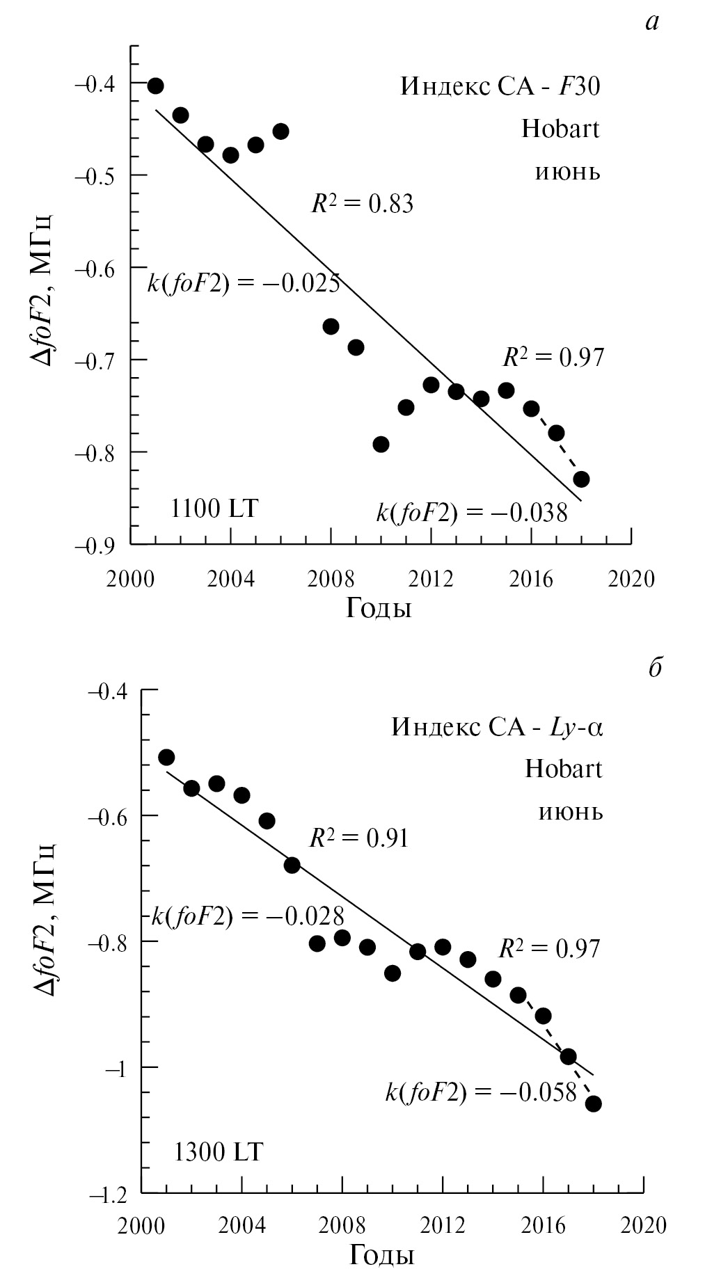 По графику зависимости ΔfoF2 от времени для каждой ситуации (станция, месяц, индекс СА) строилась соответствующая таблица с полученными параметрами. Чтобы не перегружать статью таблицами, мы приводим в табл. 1 в качестве примера результаты только для двух ситуаций. В этой таблице для каждой ситуации приводится тренд k(foF2) для всех пяти моментов LT для всего анализируемого периода 1996–2023 гг. с соответствующими величинами R2, а также тренд для недавних лет также c величинами R2.