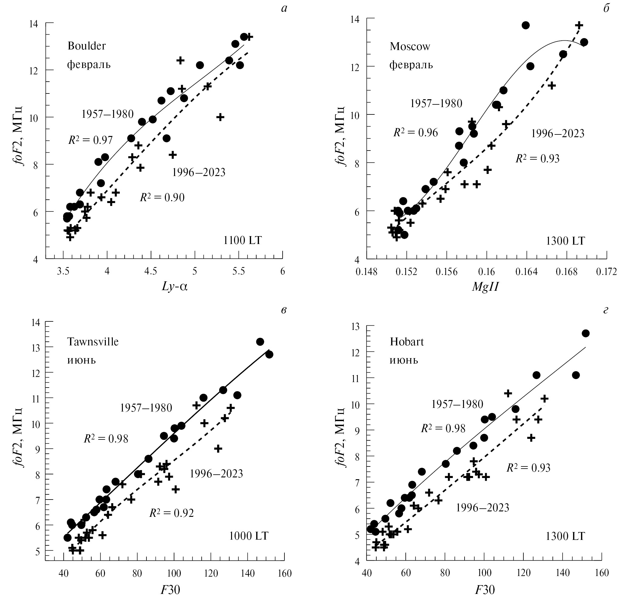 - Laštovička J., Burešová D. Relationships between foF2 and various solar activity proxies // Space Weather V. 21. № 4. ID e2022SW003359. 2023. https://doi.org/10.1029/2022SW003359