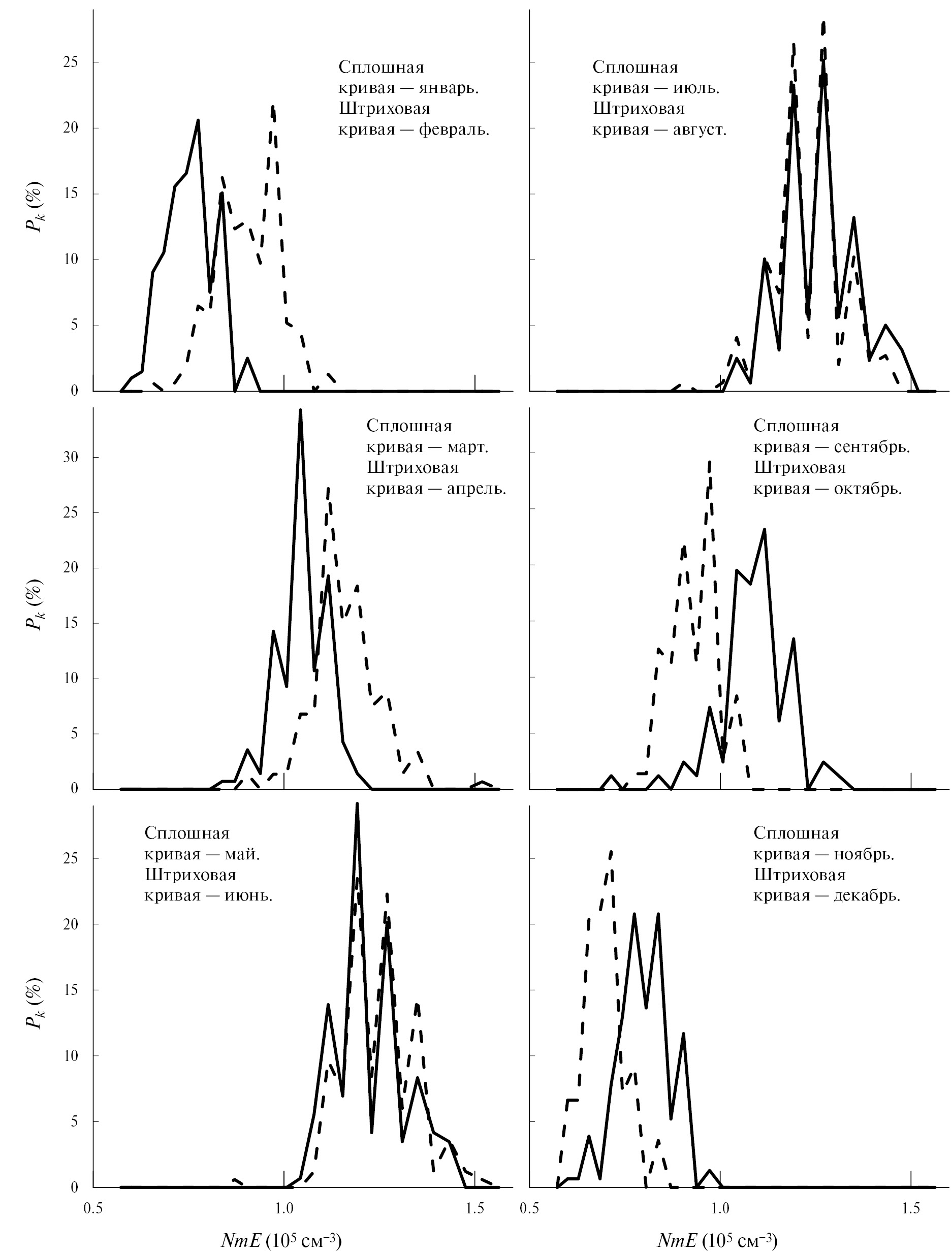Рис. 1. Зависимость Pk от NmE в 12:00 UT (12:18 SLT) при низкой солнечной активности. Сплошные и штриховые кривые соответствуют январю и февралю (верхняя левая панель), марту и апрелю (средняя левая панель), маю и июню (нижняя левая панель), июлю и августу (верхняя правая панель), сентябрю и октябрю (средняя правая панель) и ноябрю и декабрю (нижняя правая панель).