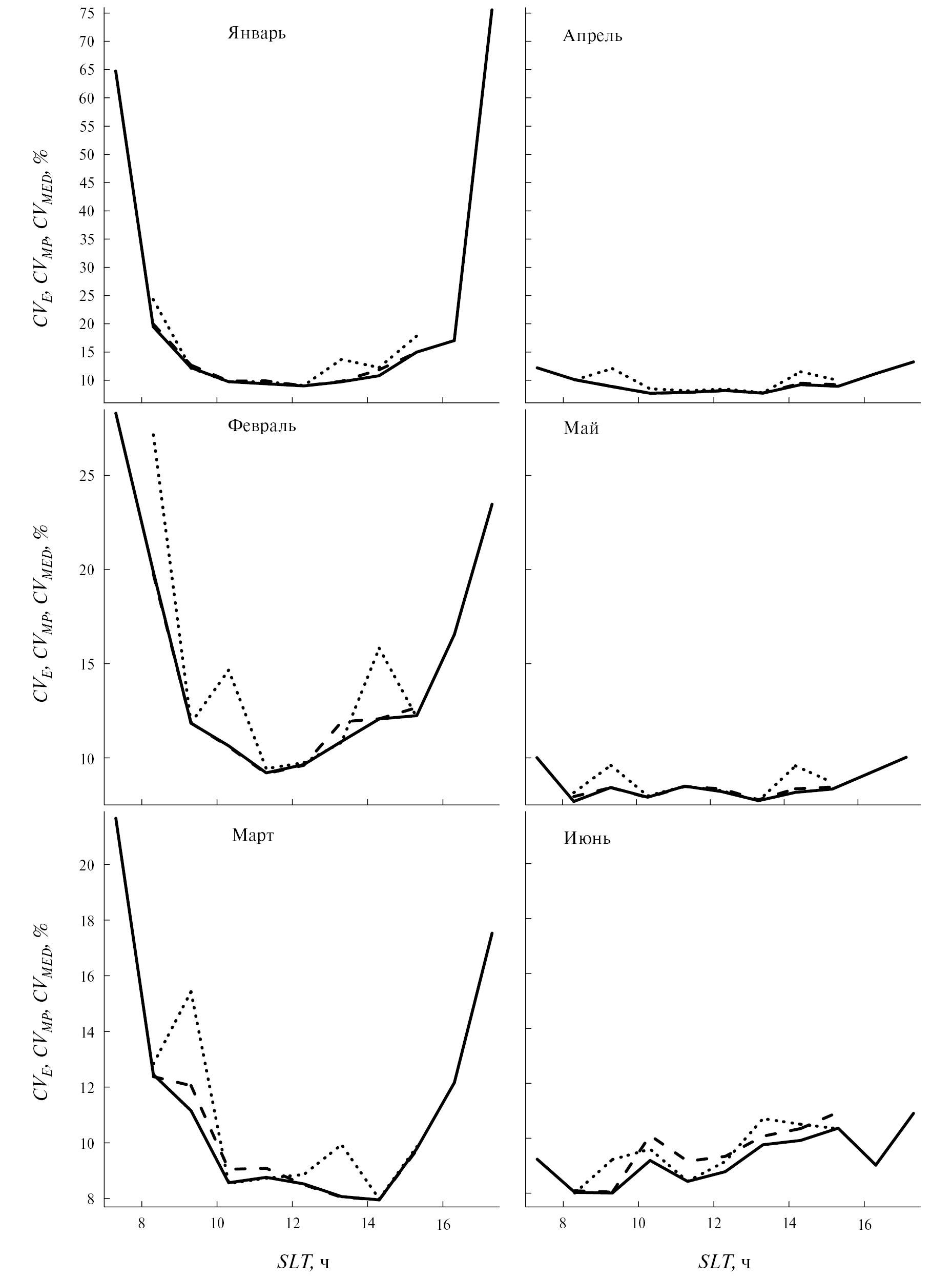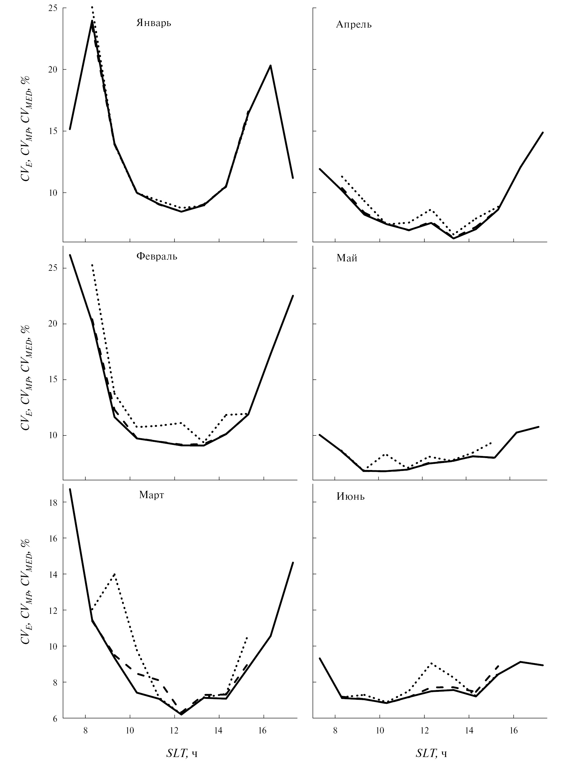 Рис. 3. Суточные вариации CVE (сплошные кривые), CVMP (пунктирные кривые) и CVMED (штриховые кривые) для января (верхняя левая панель), февраля (средняя левая панель), марта (нижняя левая панель), апреля (верхняя правая панель), мая (средняя правая панель) и июня (нижняя правая панель) при низкой солнечной активности.