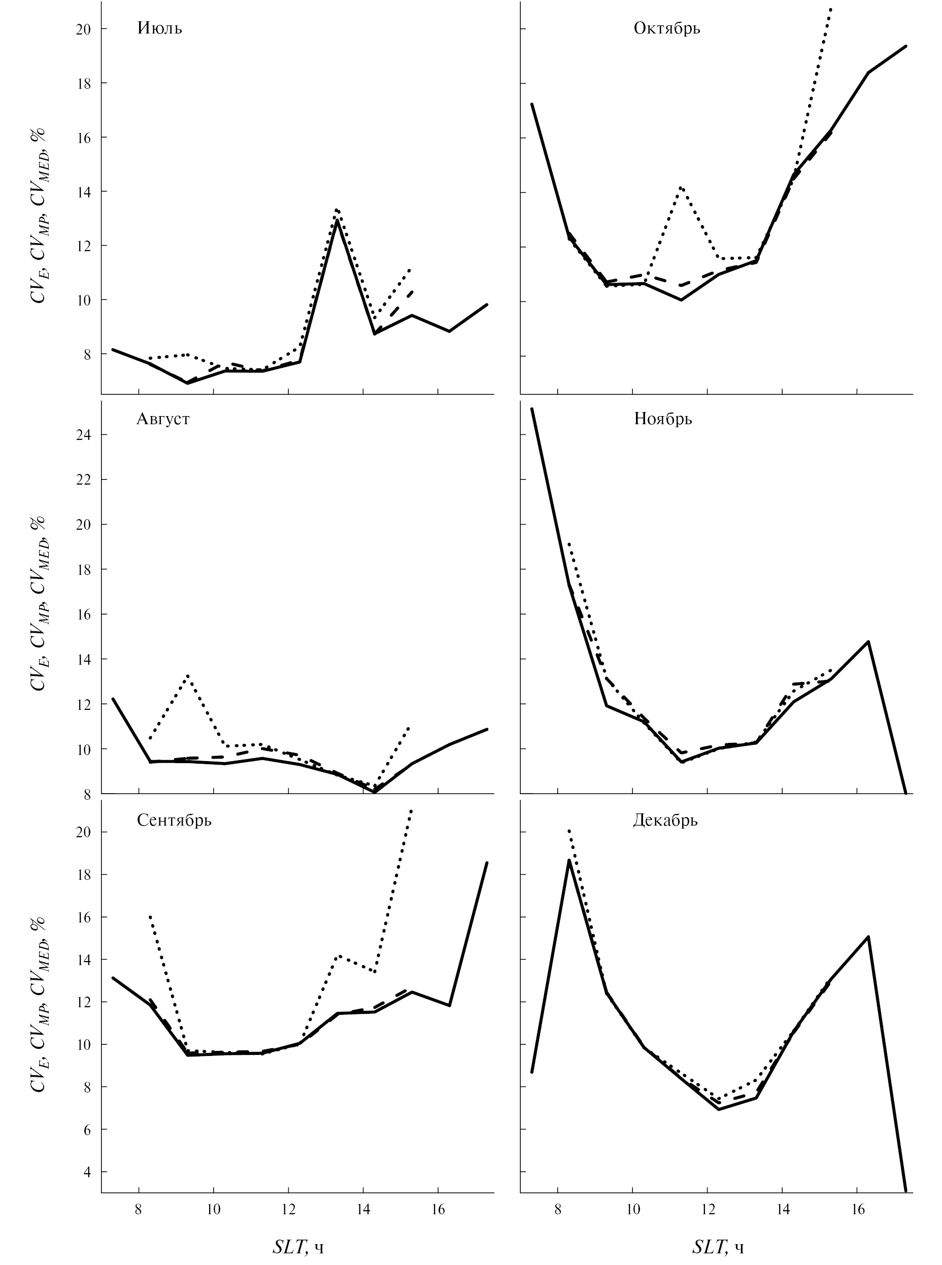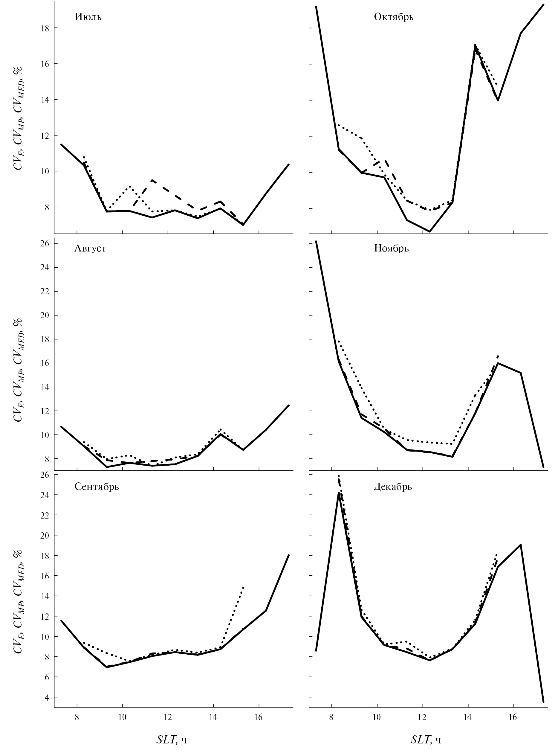 Рис. 4. Суточные вариации CVE (сплошные кривые), CVMP (пунктирные кривые) и CVMED (штриховые кривые) для июля (верхняя левая панель), августа (средняя левая панель), сентября (нижняя левая панель), октября (верхняя правая панель), ноября (средняя правая панель) и декабря (нижняя правая панель) при низкой солнечной активности.