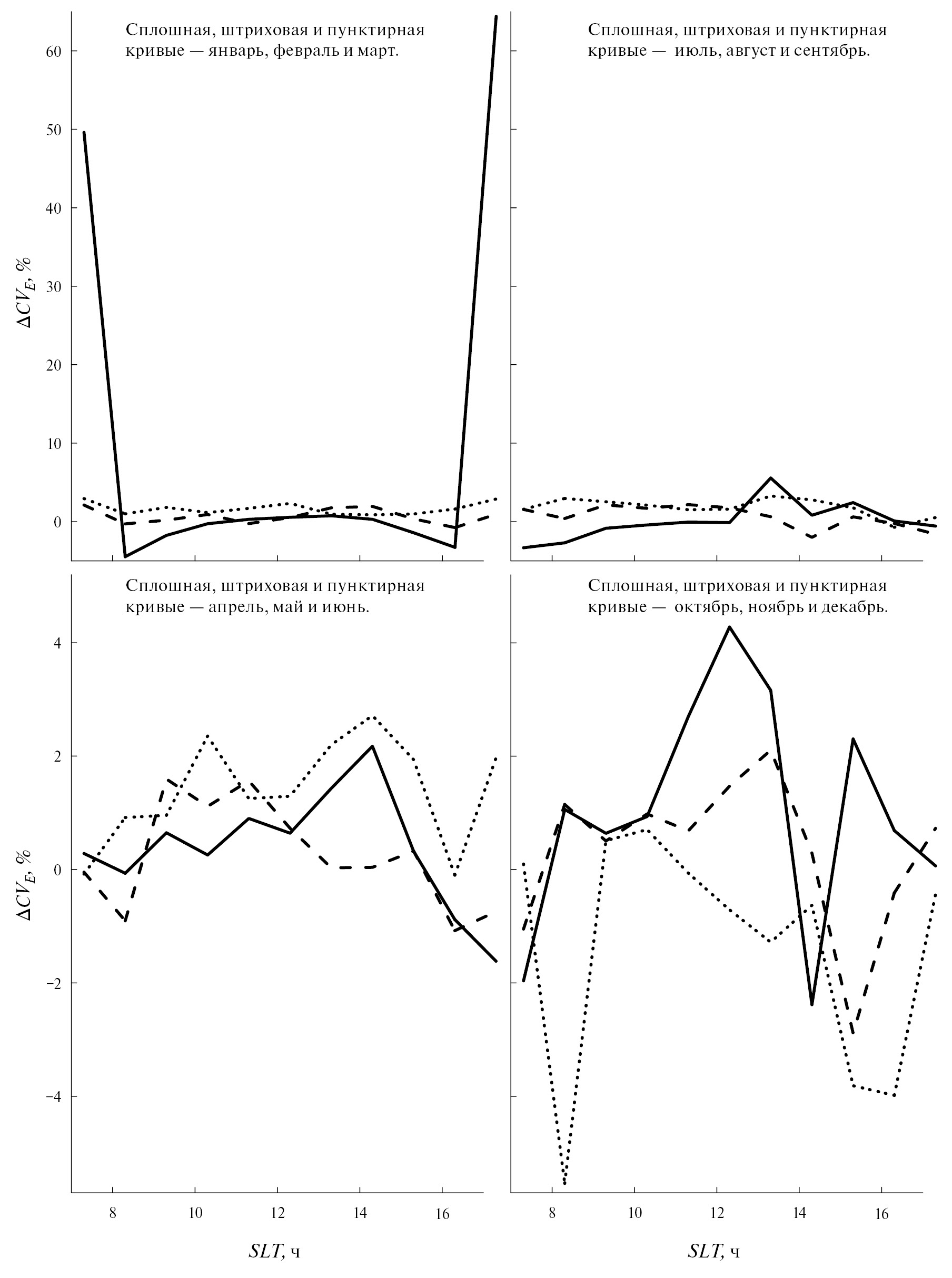 Рис. 7. Суточные вариации ∆ CVE в январе, феврале и марте (сплошные, штриховые и пунктирные кривые соответственно на верхней левой панели), в апреле, мае и июне (сплошные, штриховые и пунктирные кривые соответственно на нижней левой панели), в июле, августе и сентябре (сплошные, штриховые и пунктирные кривые соответственно на верхней правой панели), в октябре, ноябре и декабре (сплошные, штриховые и пунктирные кривые соответственно на нижней правой панели).