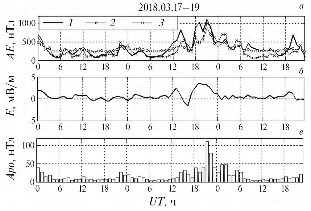 Рис. 5. Данные наблюдений и расчеты по модели во время бури с 17 по 19 марта 2018 г. (а) 1 − наблюдения АЕ-индекса; 2 − расчет по модели (2); 3 − расчет по модели (4); (б) наблюдения электрического поля E; (в) наблюдения индекса Apo.