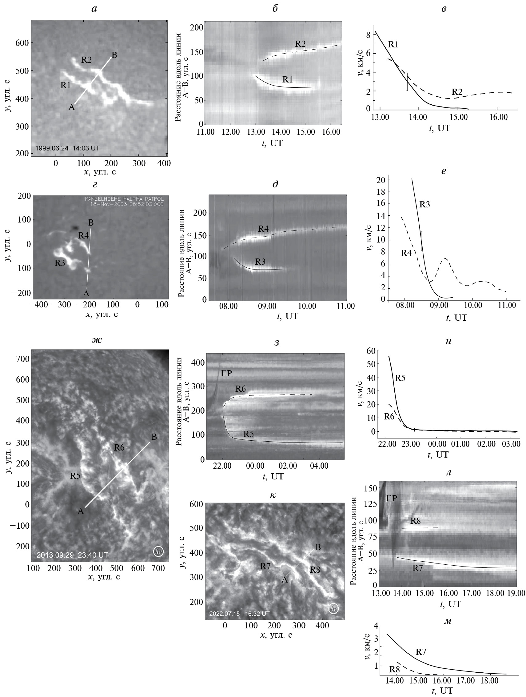 На рис. 1 показаны примеры вспышечных лент, появившихся после эрупций солнечных волокон (протуберанцев). Использованы наблюдения в линии Hα Медонской обсерватории (https://bass2000.obspm.fr/home.php) и Солнечной обсерватории Канцельхойе (http://cesar.kso.ac.at), а также в канале 304 Å инструмента AIA (Atmospheric Imaging Assembly [Lemen et al., 2012]) на борту космической обсерватории SDO (Solar Dynamic Observatory). В первой колонке приведены фрагменты фильтрограмм с лентами вблизи периода их максимального расхождения. Ленты обозначены как R1 – R8. На каждом фрагменте обозначена линия A–B, пересекающая вспышечные ленты приблизительно перпендикулярно, по изменениям распределения яркости вдоль которой строились диаграммы яркость–время, приведенные во второй колонке. На диаграммах видно, что ленты появляются на линии A–B не обязательно одновременно и между ними с самого начала существует промежуток. Темные полоски с большим наклоном на панелях з и л – следы быстрого перемещения эруптивных волокон. Примерно вдоль середины траектории перемещения каждой ленты проведены линии: сплошная для нижних лент на диаграммах, которые соответствуют юго-восточным лентам на фильтрограммах в левой колонке, и штриховая для верхних, северо-западных, лент. Эти аппроксимирующие перемещение лент кривые использовались для вычислений скоростей расхождения лент. Правая колонка рис. 1 – графики зависимости скорости движения лент от времени. Штриховые линии соответствуют лентам, расположенным северо-западнее, как и на диаграммах в средней колонке.