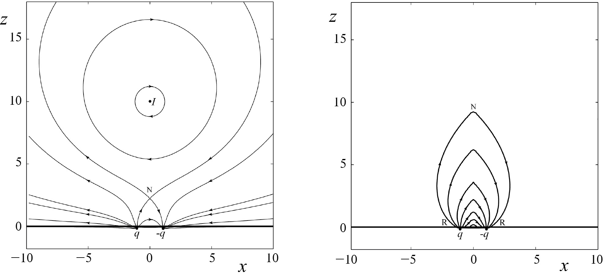 где ось z – вертикальна; I – величина электрического тока, текущего вдоль оси y, вдоль которой все величины не меняются; h – высота положения тока над фотосферой; Bxq – внешнее магнитное поле, создаваемое двумя источниками (“магнитными зарядами” q и –q); m – масса протуберанца; g – ускорение силы тяжести; c – скорость света. Первый член в правой части уравнения описывает взаимодействие коронального тока с плотной проводящей фотосферой, индукционные токи на поверхности которой, как обычно, заменяются эквивалентным “зеркальным током” – I, текущим на глубине – h под поверхностью [Kuperus and Raadu, 1974]. Компоненты магнитного поля тока, текущего в короне и его зеркального изображения описываются выражениями