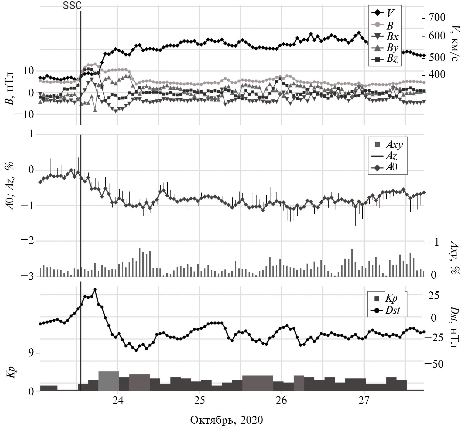 Рисунок 4 показывает поведение основных параметров ММП, СВ, КЛ и ГА в событии 23–27 октября 2020 г., вошедшем в группу MIX HSS. Источником этого межпланетного возмущения стало длительное совместное воздействие высокоскоростных потоков из КД CH976 и CH977 (https://solen.info/solar/coronal_holes.html), проходивших центральный солнечный меридиан в период с 19 по 24 октября, а также КВМ, связанного с эрупцией волокна над АО 12776, произошедшей около 12 UT 19 февраля (https://cdaw.gsfc.nasa.gov/movie/make_javamovie.php?img1=sdo_a193&img2=goesx&date=20201019). Данный КВМ не был зарегистрирован в коронографе, но, по-видимому, оказал влияние на околоземное космическое пространство, поскольку произошел в подходящее время, и в данных СВ и ММП в первые часы после регистрации ударной волны (23 октября в 13:20 UT) имеются признаки структуры КВМ (повышенное поле при небольшой скорости, вращение компонент ММП), а затем уже начинается сам высокоскоростной поток, однако четкой границы между этими возмущениями СВ нет. Кроме того, аналогичные признаки структуры КВМ обнаруживаются и позже, внутри высокоскоростного потока (25 октября). Максимальное значение ММП в этом событии составило Bmax = 13.3 нТл, скорости СВ Vmax = 619 км/с (верхняя панель рис. 4). В вариациях потока КЛ (средняя панель рис. 4) зарегистрированы следующие экстремальные значения: AF = 1.1%, Axymax = 0.82%, Azrange = 0.63%. В данном событии также были зарегистрированы интервалы малой магнитной бури (нижняя панель рис. 4, Kpmax = 5–, Dstmin = = –38 нТл).