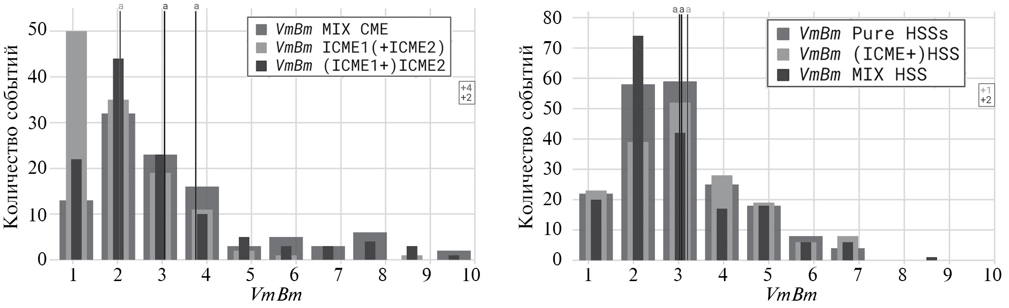 Рис. 5. Распределение значений параметра VmBm для разных групп событий.
