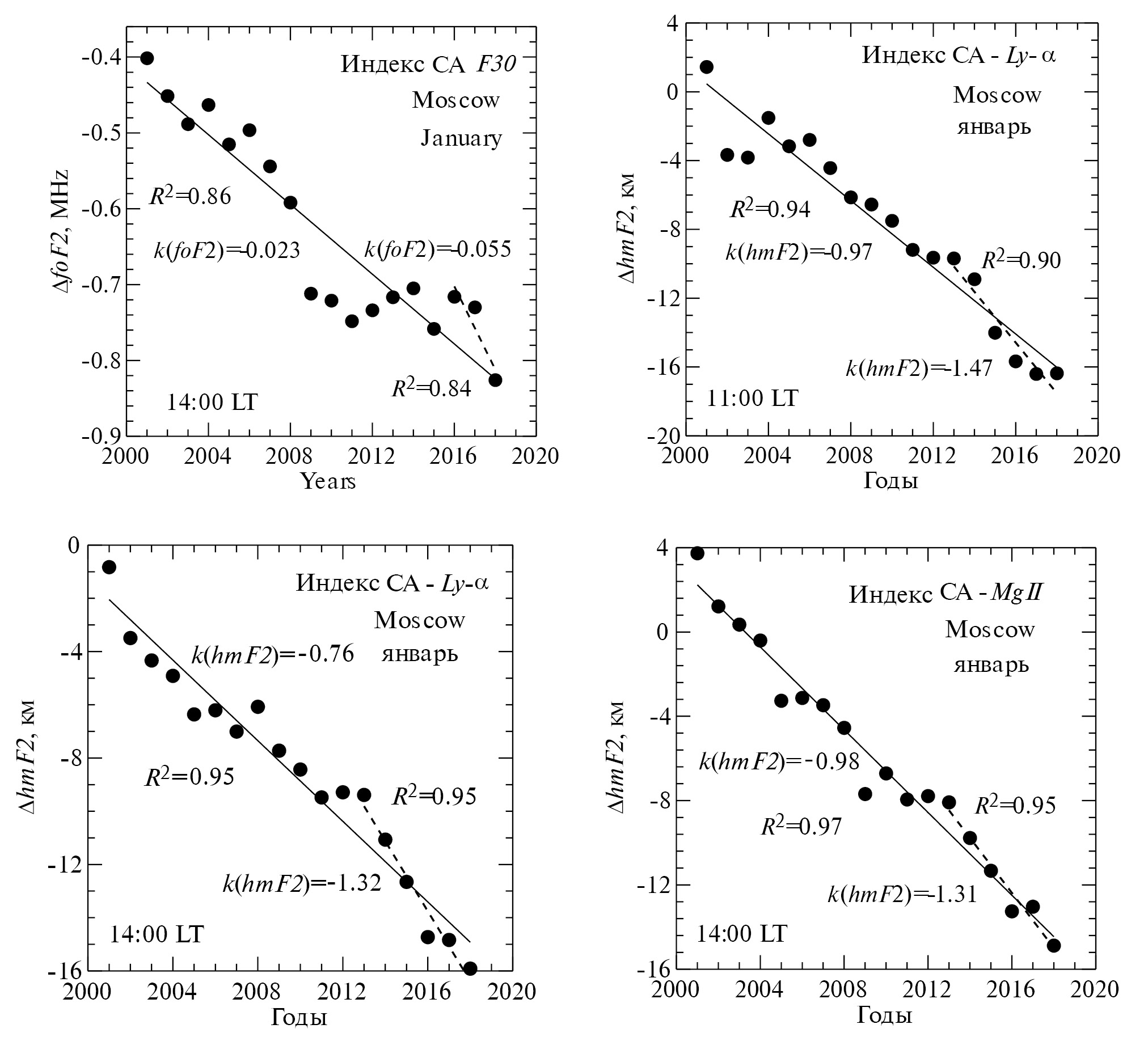 Мы рассматривали околополуденные часы суток (10:00–14:00 LT) и два типичных зимних месяца январь и февраль, как это часто делается в наших работах по поиску трендов критической частоты слоя F2. Для устранения эффектов солнечной активности мы использовали три индекса СА (F30, Ly-a и MgII), которые были признаны лучшими для описания поведения слоя F2 [Данилов и Бербенева, 2024; Данилов и др., 2023в; Danilov and Berbeneva, 2023].